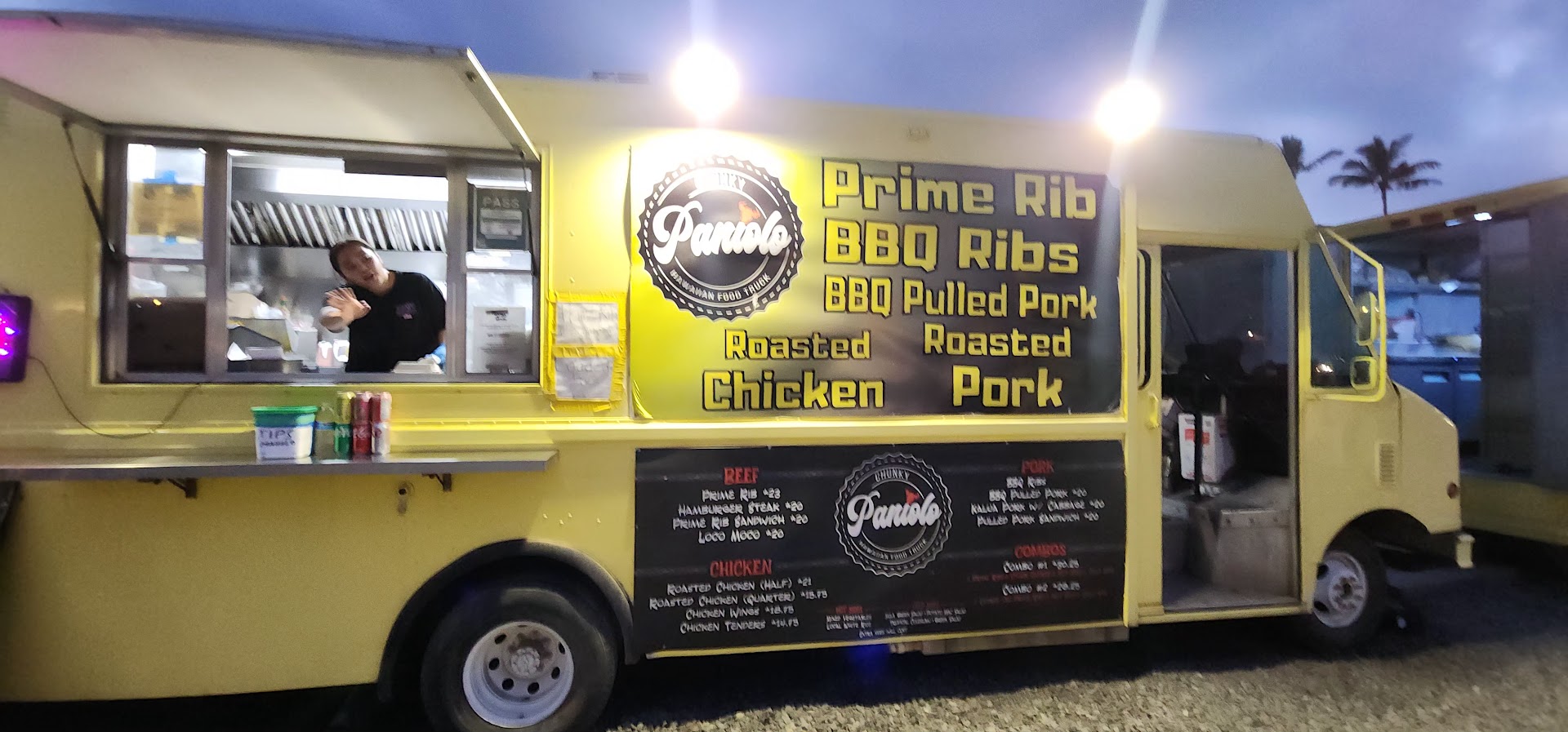 Chunky paniolo was an amazing experience. The prime rib was cooked a perfect medium (though the outside of the steak was browned, it was still thick enough to have some red/pink in the middle). And we must have gotten an extra chicken quarter because my wife got two of them.. You get some breast, thigh, AND drumstick... Skin too! Even though I got the wrong side dish (I asked for mashed potatoes but I got vegetables) it was still delicious. We waited in line longer than we waited for the food. It came out after about 3 minutes!! Hot and fresh. It's a little pricey for a food truck ($45 after the $8 tip) but we'll worth it. And we still have the second chicken quarter as leftovers :). Chicken was so tender and delicious, perfectly cooked.. if getting that extra chicken quarter wasn't a mistake, then I can safely say that YOU SHOULD EAT Here and that chicken meal can be split by two ppl!