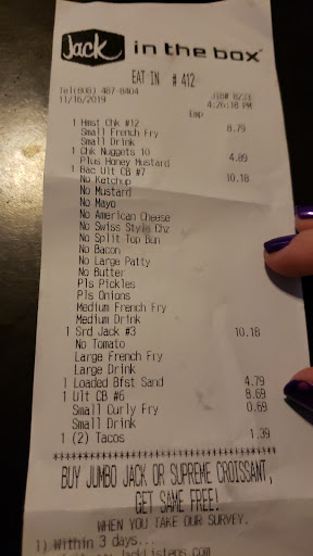 Read moreFirst off, I don't know what the drive through was multitasking while take our order. We thoroughly gave our order twice. And the whole time he was not listening, being absent from his ears to customer service. Before we left I checked to make sure we had everything we ordered. By the time we got home I learned my sour dough jack was just thrown together with not being toasted grilled as it has been for the past 20 plus years that I've been eating it. My hubby calls , asks for a manager, explains why we were upset. The female manager says its because their machine is being serviced. Well miss manager and jack in the box team that should be noted in drive through or front window so we know not what to order. HUBBY MANAGED FAST FOOD FOR YEARS AND WE KNOW FOR SURE JACKS WAIMALU MANAGER DID NOT HANDLE IT WELL. ONLY EXCUSES. WHY WOULD WE WANT A REPLACEMENT FOR A SANDWICH OF WHICH YPU DON'T HAVE THE PROLER MACHINE, TOOLS ETC TO MAKE...