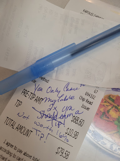 Read moreI can only tell you that this place did not meet my expectations and that I experienced some of the negative things mentioned in yelp reviews about this restaurant. I had dinner with my Ohana. We were served primarily by an older Asian man I presume he was the manager or owner cause he looked the part. He took our order, served some of the food, and made certain that he collected the payment after the meal. I ordered enough food to serve two separate tables of our party. You expect the food to be served at the same time, on both tables but that wasn't the case. Our 2nd table got served some of the same dishes minutes after the 1st table was served and set to begin eating. The food was unexceptional. We also witnessed a commotion in progress with a very unhappy customer. It was loud and unpleasant. One of the comments I heard from the customer to the staff was "your laughing at me doesn't help things and this situation" Appears to be a lack of customer and management service skills. Lastly, the server guy brought my check back to be signed by me, with his tip already entered on the tip line. The tip he entered absolutely did NOT reflect the service or the dining experience. My money was NOT well spent. I learned the hard way and won't be returning unless another restaurant opens here. Try the many other great dining options in the near vicinity or just a few...
