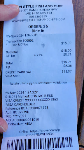 Read moreMy review is mainly about the unscrupulous way that this establishment imposes a tip (15% of entire order and taxes). I order a portion of fish & chips and after scanning my card, the screen moved fast to the tiping panel then on a blink of an eye the tip was added to my order and ....I was asked if I need a receipt. After checking it, I discovered the extra charge. Totally unprofessional but ...hei ...someone has to make a living! I asked the young lady at the counter about the charge and she stayed that "there is an option that you can cancel it...if you want". First of all , that should be and option that I can choose if I want to pay a tip, without being imposed by the seller. Second, everything is happening to fast so ..I know time is money but are my money. In the end, is not about the 2, 3 extra bucks that you might pay when you order, but is about the way how they do it. Shame on you !!! If she would have apologies for it or try to make it up somehow I would might say is a mistake but unfortunately they didn't because that's how they do it....you have to have some guts to do it this way...but will mostlikely not get you to far on...