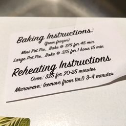 FOOD: Chicken Pot Pie Go big or go home! All the homemade pot pies are frozen, and they need at least an hour's notice if you'd like it baked there. We took it home and popped it in the oven per the on-box directions, 375-degrees for 75 minutes, and it came out perfect. We didn't let it set so the contents came oozing out as we sliced it, which was fine because it was piping hot. The crust was buttery and flavorful, with a subtle crunch and moist interior. The filling was savory with an herby-peppery flavor, with chunky bits of chicken, potatoes, peas, carrots, onions and mushrooms. I haven't had many pot pies to compare to, but I really liked it here.