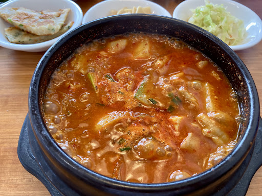 A note on drinks... they are not refillable. If you are the type that drinks 3 or 4 sodas while you are there, you will be very upset as one of my co-workers was. Each soda is $1.75. After they took our drink order, we waited for a while to get our food ordered. They were kind of busy, but still. We ordered and a little bit before our food came out they brought our rice and the sides. I think out of everything, I really liked the tofu and pancake. The rest of the table liked the sautéed cabbage and kim chee, which was good but I felt I had better elsewhere. They also offered seaweed, daikon, and that aburagi tofu strip thing. For a table of 6, it was not a lot, but we asked and they brought more sides as we completed them. For the taste of the sides, I raise my rating by a half point.