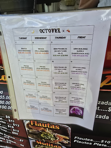 Read moreExcellent Mexican food in Pahoa, definitely not on my bingo card for my trip to Hawaii. They offer a variety of dishes and protein options, and the price is pretty good considering you’re in the middle of the Pacific. Their horchata is also among the best I’ve ever had, and I’ve had quite a bit. They travel around to different locations throughout the week, including a stop in Hilo on Thursdays, but the setup in Pahoa included live music which made it even better. You may have to wait in line for a bit to order, but the food comes out quickly and it’s...