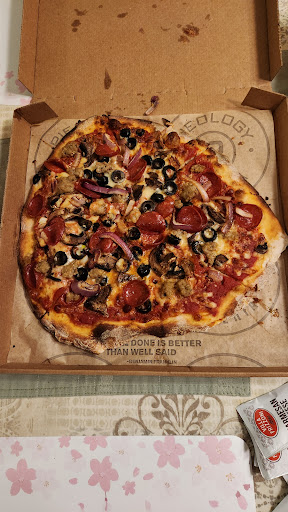 When they finally served up my pizza, the picture shown is what I got. A wheel of bread on which it appears some toppings fell from nearby pizzas. This is the quality they give these days at this place? A 10" pizza means each piece is 5" from corner to crust. I have about 3" of crust there with no toppings or even sauce to cover the bread. So about 20% of my pizza has toppings on it. This is straight robbery advertising you make pizzas but giving me a wheel of bread with nearly no toppings whatsoever.