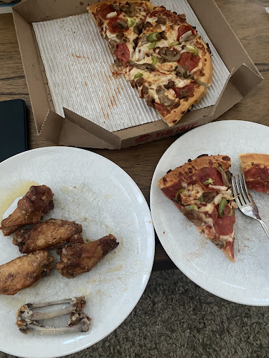 Our favorite is the Veggie Lover's Pizza, either hand tossed or thin-and-crispy or else Italian sausage with green peppers and onions. Both combinations are non-greasy and very tasty. If you really like your thin and crispy to be extra crispy, ask for the pizza to be "well done"! The staff will put it back through the oven again. The salads (garden or Caesar) are large enough for two or three. The wings (a favorite, but infrequently ordered) are quite good, but a young person's food (heartburn anyone?).
