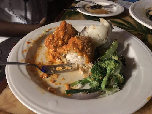 The cocktails we ordered weren't very strong. My margarita barely tasted of one. For food, we ordered the Opakapaka Filet (on the smaller menu), which was sauteed and served with a lemon butter caper sauce. I honestly couldn't even finish this dish, it was straight up gross. The mashed potatoes weren't hot nor were they mashed. I had a full sized potato lump on the plate. The fish was coated in flour and then sauteed, so all you tasted was the coating rather than the delicate fish. Then they served this horrible white (no joke, it looks like white paint) on the fish. The sauce was cold and I'm assuming what made me ill. It must has just been a batch they made at some point during the day and they just throw it on the fish. I could only eat a handful of bites before calling it quits.