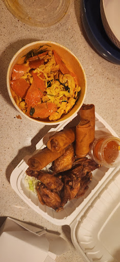 6 dried-out scrawny "Royal Thai" chicken wings, four vegetables spring rolls: Both tasted like they had been in a freezer for months. AND ...no rice.😳