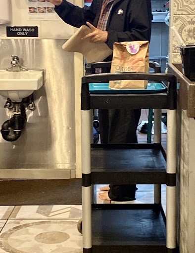 You sanctimoniously insisted she couldn't stay, but no one questions your unkempt manager who walked in while we're eating--in his flip flops--and nastily takes them off behind the counter.