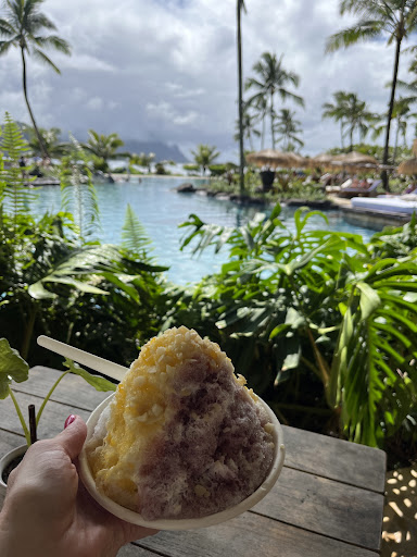The smoothness of the ice is excellent, with very little chunks of ice. The menu has a lot of variety, and you have the choice of five different named dishes, or creating your own. The create-your own invites you to choose a gelato or sorbet, house-made syrups, and toppings. Everything we had was delicious; I would recommend getting the Mai Tai gelato in your shave ice. The atmosphere is great: poolside, right along Hanalei Bay, with the mountains in the background. The only thing keeping Wai’Oli from being the best on the island is the exorbitant price. $14 or $15 for a medium-sized bowl. Offensive by island standards, but probably a bargain for guests at the 1 Hotel...