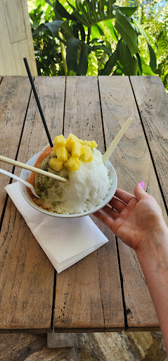 This place is a hidden gem! I've tried a majority of the shave ice places on Kauai that use fruit-derived flavors (ie no artificial flavors) and this is one of my top picks. You have to go through the 1hotel and take 2 elevators to get there but it's well worth the detour and the hotel offers gorgeous views of Hanalei Bay. The shave ice is $15 but it's about 2x the size of your standard shave ice and you get to pick 5 flavors plus real fruit toppings. It's easy to split with someone else and the price ends up feeling pretty comparable to getting 2 shave ices anywhere else. Every flavor that I tried was delicious (guava, matcha, coconut, pineapple, and vanilla made from real vanilla beans) and the fruit was perfectly ripe.