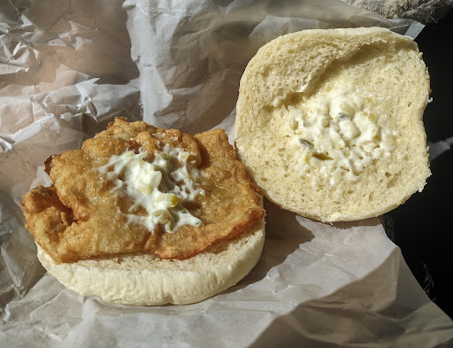 Read moreI ordered the Fried Fish Sandwich. When I got it at the L&L in Pahoa, it automatically came with lettuce, onion and tomato. This sandwich just had two super flat pieces of fish and a thin smear of tartar sauce that tasted like it came out of a packet. And that was it! Pretty ghetto! I also got the Veggies Egg Rolls. They were crispy on the outside but the filling had a slimy texture and didn't taste very good. Now the scary part: the sweet and sour sauce had no flavor, so I dumped it on the ground. That's when I noticed that there were big chunks of a thick "film" of something that had broken up and was floating around in the sauce! (See photo.) GROSSSSS! I hope I don't get sick...