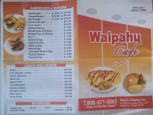 I will always have memories of waipahu cafe abd their homestyle cooking. Imagine if L&S DRIVE Inn and Yummyz BBCue, had a small personable child. It would be rightfully named Waipahu Cafe. One of the most influential dishes in the waipahu foodie community is the thin crepe like egg omelette that blankets a mountain of local style fried rice; which include, onions, sausage, secret shoyu sauce, and scallions. This fried rice omelette could also be ordered with corned beef, tuna can, kim chee, or even pork hash!! Oh, and please try yourself a aide order of banana hotcakes. This sweet delicacy is made with love. And that is just the breakfast side! I would not recommend this restaurant, only because i may have to start waiting for a seat in this very small and quaint restaurant. My recommendationn is when you have spoted a table for you bbn or your family, just sit and stare at the menu which is located to the right of the griddle ontop the wall (you can't miss it). Please be patient with the staff as this is not your normal grab and go cafe. There usually two food runners and two grill cooks. Come here when you have the morning to enjoy and leisurely enjoy a good mommasan breakfast. I know I will never go anywhere else unless they change ownership or start to charge people as if the are zippy's. No one needs...