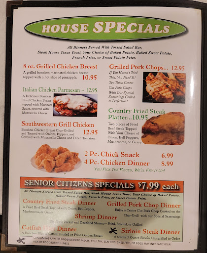 Read moreFirst of all the only reason this gets a 1 star is because it is mandatory. Plus the soft serve Ice cream was pretty good. Here is the bad. Visited 8/29/2014 7 pm. Do not live here had to wait about 10 minutes to sit, they were busy but plenty of empty tables Place was hot and stuffy, around 75-80 degrees inside. Took about 10 minutes just to give drink order. Ordered 2 buffets 2 menus Buffet food is as plain as it gets, very little flavor, everything was bland. There was a piece of grilled fish under water by its self under water the whole time we were there. I guess no one would man up and try it. Cold shrimp was in water and not on ice ( I have never seen shrimp in cold water) fried oysters were real doughy. Nothing but the salad bar and ice cream worth the $18 cost of the buffet. Not sure if you can eat that much lettuce!. Waitress walked by several time with out asking if we needed anything. You have to wave them down. Menu items: Beef tips well done, gravy tasted burnt like the beef tips. The beef tips were 15 minutes away of being Beef jerky. The baked potato was delicious, (not really it just so happen to be the best part of the meal) Other menu item was a shrimp plate. The sad part about this was it is the same kind of shrimp on the buffet and it took over 20 minutes to get it. The fries were soggy. Bathrooms are dirty but not nasty yet, getting there though. Miscellaneous Watched another waitress spend most of her time talking to a male customer by himself. Thank goodness we didn't get her or we would of had to go to McDs Conclusion: avoid it like the plague. Even if it is the only place open. I have had better seafood in the mountains far away...