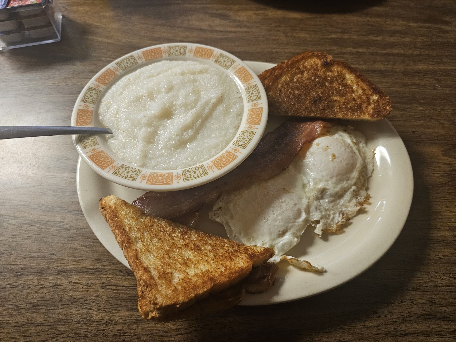 First reason for low rating is the smoke filled restaurant. I thought smoking was prohibited in restaurants in Texas now. Normally would have just walked out but needed to get hubby fed before a dental appointment. Second, over medium eggs ran all over the plate when cut into and yellow still cold. Third, you could not even soak it up with toast as the toast was drenched in butter! You could squeeze the butter by just touching the toast. On a positive note the bacon was crisp and thick and sausage was good. The hash browns were good but only enough for about three bites. The coffee was great would have liked real creamer but not a deal...