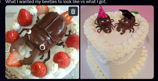 My expectations on my birthday were destroyed. The beetles were absolutely horrendous. Ugly beyond compare. Looked nothing like the reference image I had provided. I was so upset over how the decorations looked that I demanded they remove it from the cake before my family went to pick it up. For a price at $120 for a custom cake, this was an unprofessional job and mediocre.