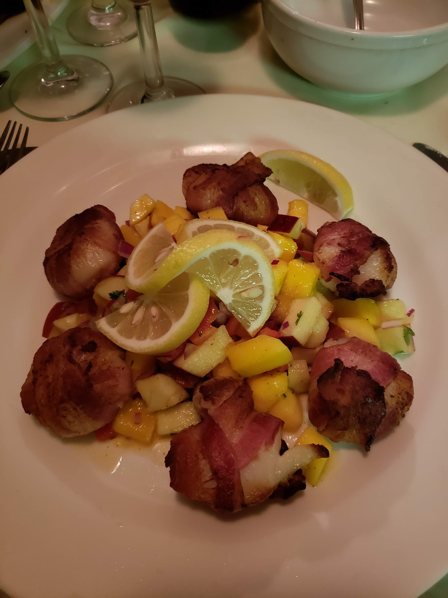 We started the meal sharing an order of stuffed mushrooms, large and white filled with seafood and not a lot of bread, served with a lemon sauce that paired very nicely. For the entrée, I had one of the specials, pappardelle served with scallops, shrimp, a small lobster tail, and a creamy vodka sauce. The pappardelle was fresh and there was an abundance of shrimp and scallops. My date had the grilled salmon, served with broccoli rabe, the salmon was grilled to perfection. It was cannoli for dessert with a crispy shell, a smooth and creamy filling, drizzled with some chocolate and served with a dollop of whipped cream.