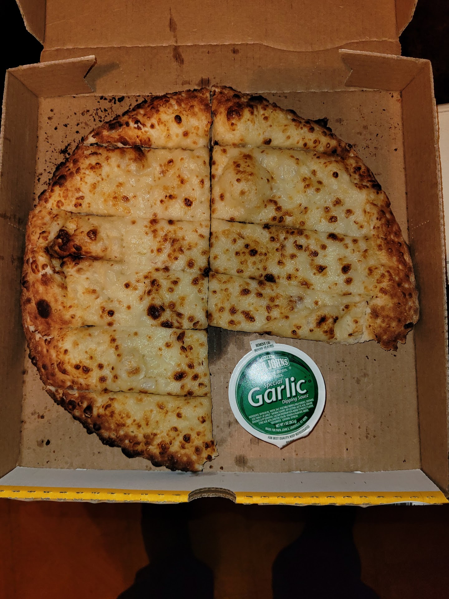 I get home and opened the box and I had a big peppercini on top of the pizza, which I like, so that's good. There was also something I'm going to call "Mystery Garlic Dipping sauce". Ok, that part was less than stellar. Think garlic flavored margarine. I tried dipping the crust in a few times. It was easy to Chuck being a small tub so that was good 😎
