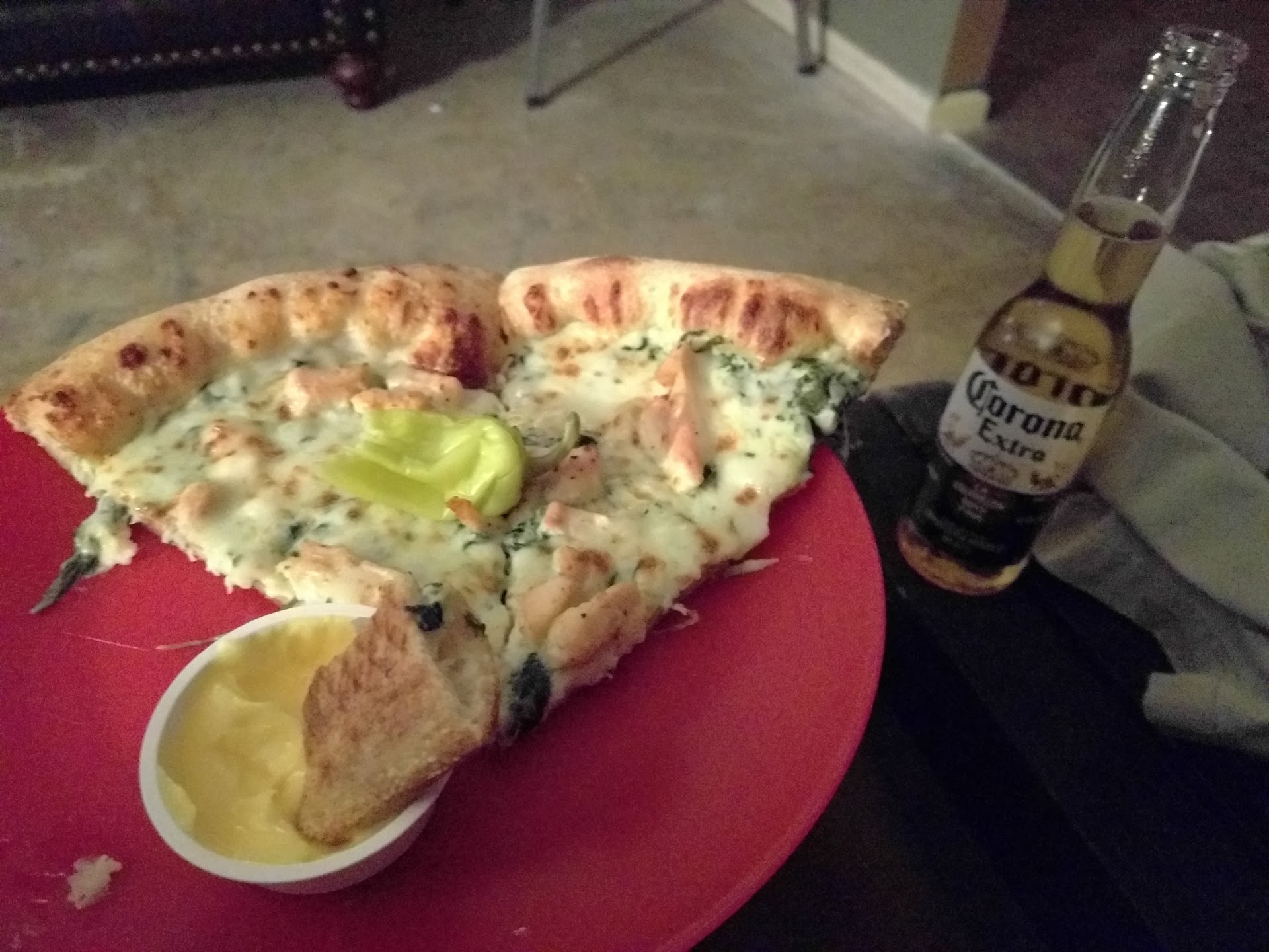 The pizza? Not bad. Spinach Alfredo with Chicken added. Not as good as other twenty dollar pizzas I've had in the past but edible. All in all not a bad experience. On a scale of 1 to 5 with 3 being average I give them a 4 for service, a 4 for quality and a 2 for value. A solid 10 out of 15. No golf claps but...