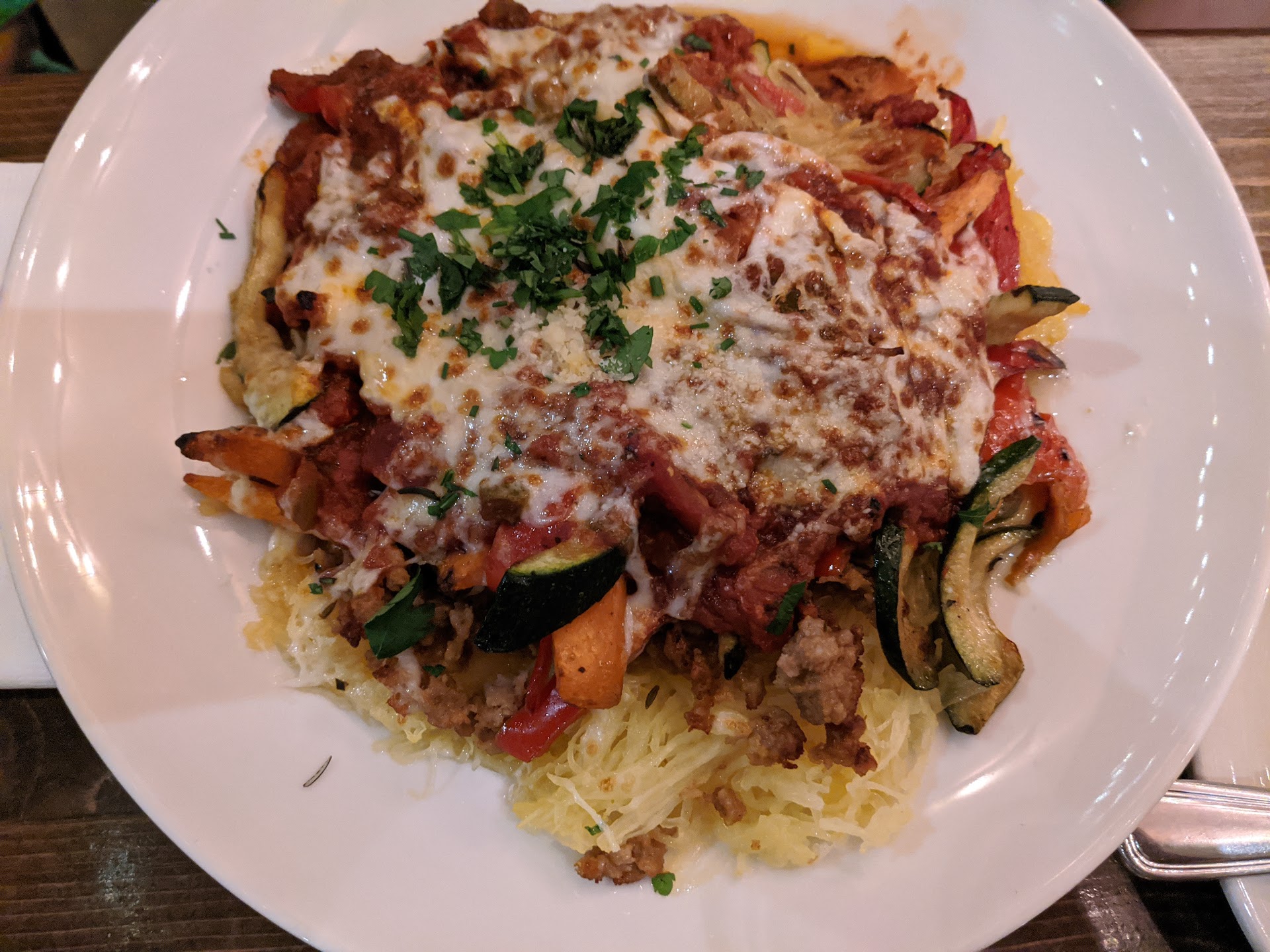 I Ordered fettuccine Alfredo adding mushrooms, shrimp and chicken. Better half ordered spaghetti squash pasta. Both single size. Better half told me the sausage, veggies and cheese in her spaghetti squash pasta was the best she keto friendly meal she has ever eaten. My fettuccine was so delightful, the chicken, shrimp and mushrooms were cooked perfectly. Great taste and texture. Shrimp was American style with tails off, slight curl. Each bite was magical. None of it was over cooked which is a common mistake. Just perfect. Compliments to the chef.