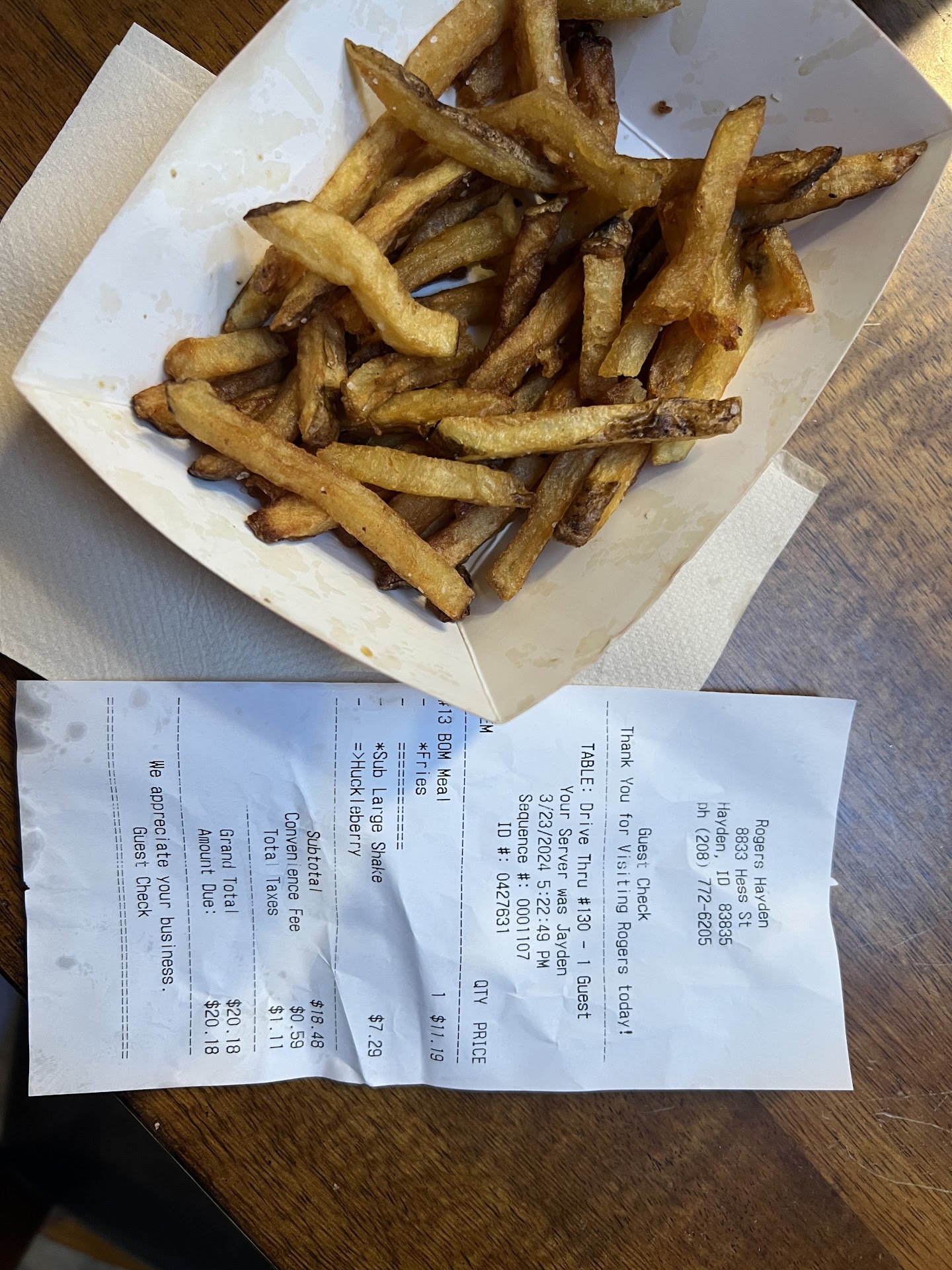 5/2/23, arrived ~6:45pm, Hayden Rogerâs on Hess. Wind blowing like mad. A table umbrella had escaped its table, and was about to collect my car when a woman customer captured it, put it back in its table, and closed it. Entered Rogerâs, lots of staff on. Things seemed disorganized behind the counter. Anyway, placed my order, and sat down to wait. Noticed the table was greasy and sticky with food matter on it. Glanced around, ditto on all of the tables. Checked the floor, same thing. Name called, went up to get burger and chocolate medium shake. Same thing I always get. Shake seemed a bit light, opened the top, it was short of full by about 1.5â. Bit into the burger: cool, not at all hot, and burned to the point where it tasted overdone. I ate what I could, then went to the trash container on the parking lot, north side, to disposes of the contents of my tray only to discover that the can was literally overflowing. The container on the south side, away from the parking lot, was about 80% full, so I dumped there. Then, restroom time. I had a choice of one of two uni-gender restrooms. Chose one only to discover that the look was broken. Went to the other, that lock was ok. The floor looked and felt like it hadnât been cleaned in about a week. All in all, my most disappointing visit to a Rogerâs, ever. I live just down the street from this Rogerâs, so I was thrilled when it opened having fallen in love with Rogerâs. I expected operational growing pains when it opened, and there were a few, but those quickly went away. However, the quality of the burgers have never reached the level of either the #1 store or the Post Falls store, which is more than a bit surprising considering that, say, In ân Out runs a far larger chain and maintains the same high quality of its product across the chain. Rogerâs WAS a reasonable comparison to In ân Out before expansion, and with the addition of the Post Falls store itâs continue the quality. Not so the Hess Street Rogerâs. The physical presentation of a restaurant is usually the responsibility of the on duty manager, say, a team leader, or whatever. Whoever was the on duty manager was obviously not being attentive to matters inside or outside...
