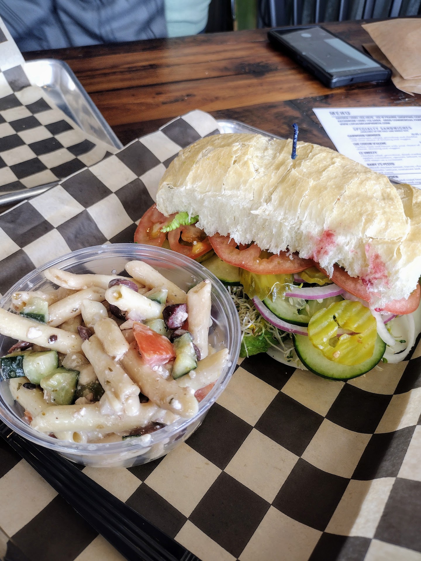 It took quite some time for the order to come out, which again I knew and didn't mind. People watching was interesting. My food was well worth the wait. The sandwich was sooo fresh, crisp, and very scrumptious. I got a half and it was huge. The bread also baked in-house was delicious and wasn't very sour. So if you like a lite sourdough then try this one. The veggies were plentiful, juicy, and crunchy and I loved the cranberry sauce addition. I would get this sandwich over and over if the quality and taste is consistent every time. The Greek pasta salad was that of what you expect a traditional Greek pasta salad would have in it. It was a decent sized portion and had good seasoning. I'm looking forward to coming back for sure.