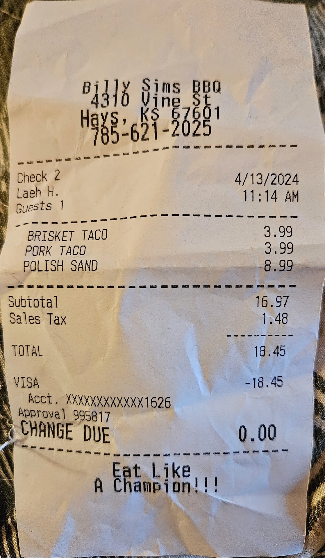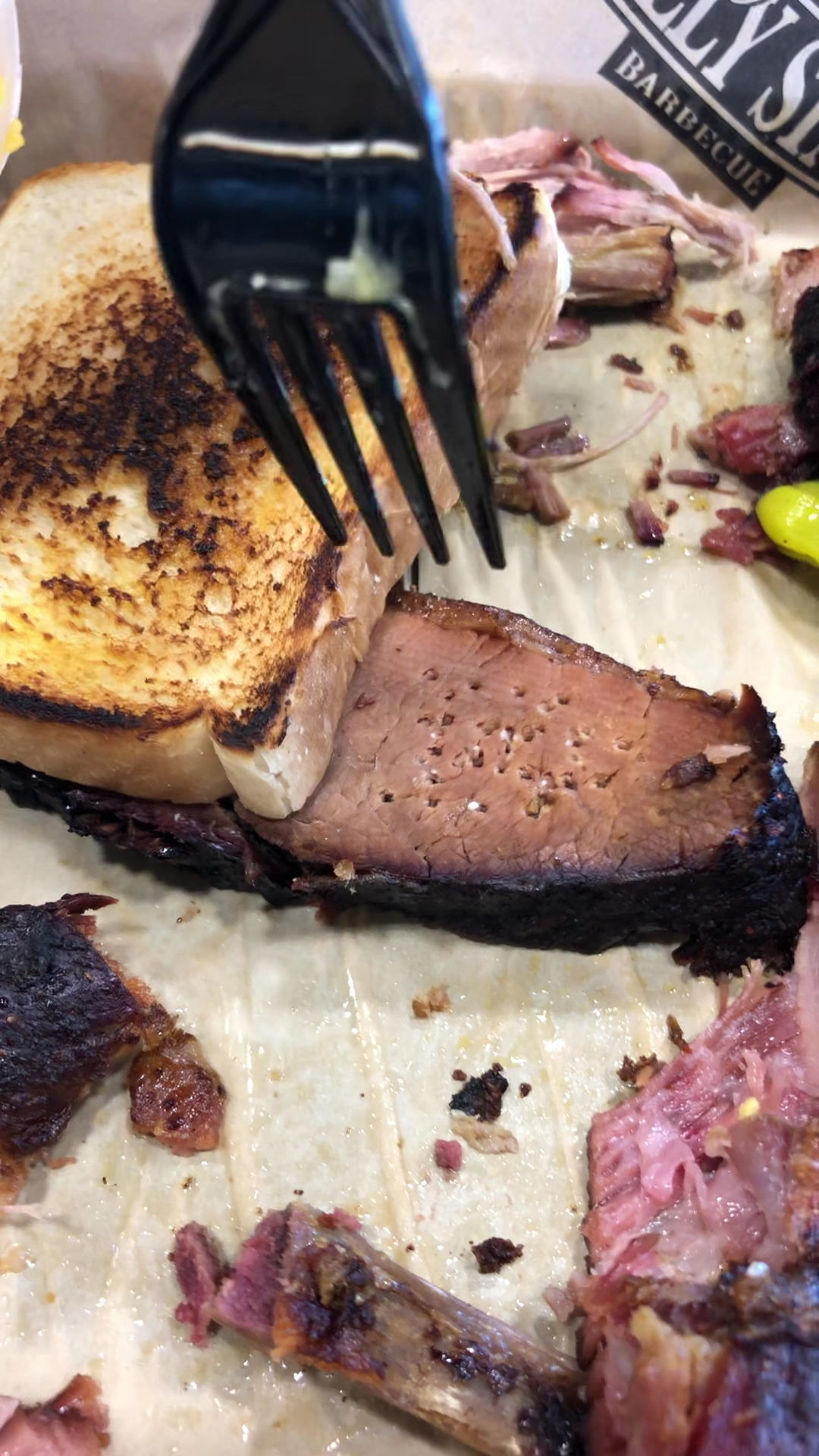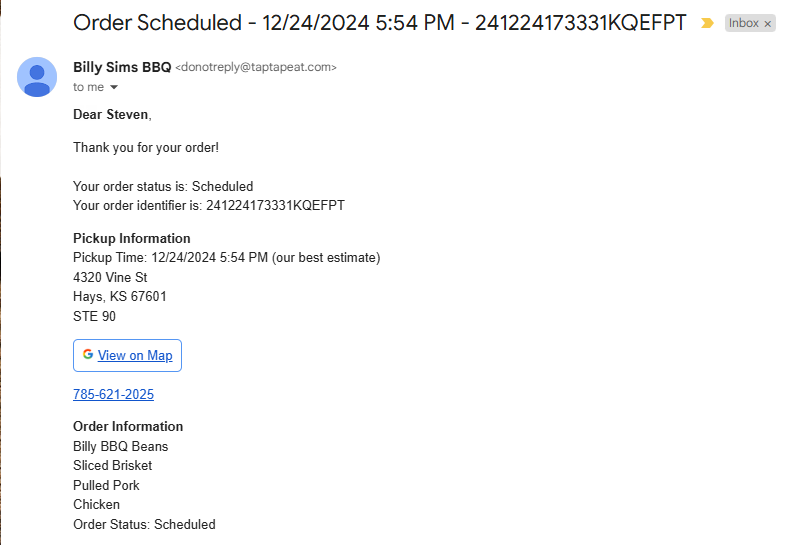 Read moreFirst time trying this place as we were in town to visit the Sternberg Museum. We were impressed with both the food and service. Great barbecue joint, with lots of options for adults and kids. No fried food meant no french fries, but the kids were happy with the selection of potato chips instead. Loved their original BBQ sauce; it reminded me of Head Country's sauce. The servers were SUPER friendly. After we went through the line and got our food, they came over to our table several times to make sure everything was satisfactory, then to see if they could help get trays out of our way, then again to offer boxes for leftover food. My husband enjoyed his legendary spud, and I really liked both the chicken & pork tacos. The pork in particular was flavorful and juicy. We will have to come back to this...
