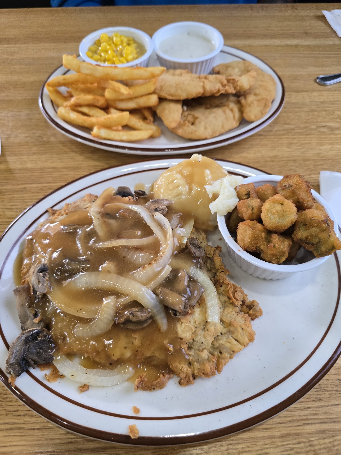 We ordered the Pork Chop and the Chicken Fried Steak Sandwich, both of which were delicious and our ticket came to $38 (with drinks and sides) so very affordable. Time from being sat until food delivery was less than 20 minutes - kudos to the kitchen for being on top of their ticket times!