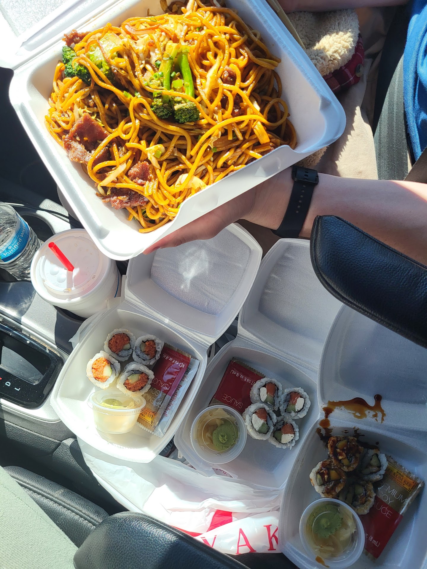 I feel like I need to somehow do two different reviews, one for the sushi and one for the other food! The sushi would get 2/5 stars. It was fresh and tasted okay. At about $6/roll. I think it's not worth it. Might as well get grocery store sushi. I do love that it's available at drive-thru. I feel like that is really rare for sushi. I recommend their Philadelphia roll, but do not recommend their tuna or eel. The eel roll would have been okay if it had way less sauce. It was SMOTHERED. I didn't want eel sauce plain. I wanted sushi with a little eel sauce on top. I tried to scrape it off, and that worked okay. It was 3/5 after that. On the other hand, that beef lo mein was actually the BEST lo mein I have ever had! The noodles were so yummy (not just cheap spaghetti like many other restaurants) the sauce was great. The beef was cooked perfectly. A little seared on the outside and slightly sweet. The portions were very large. If I was to go again I would get one $9 lo mein plate per 2 people and skip the sushi entirely.