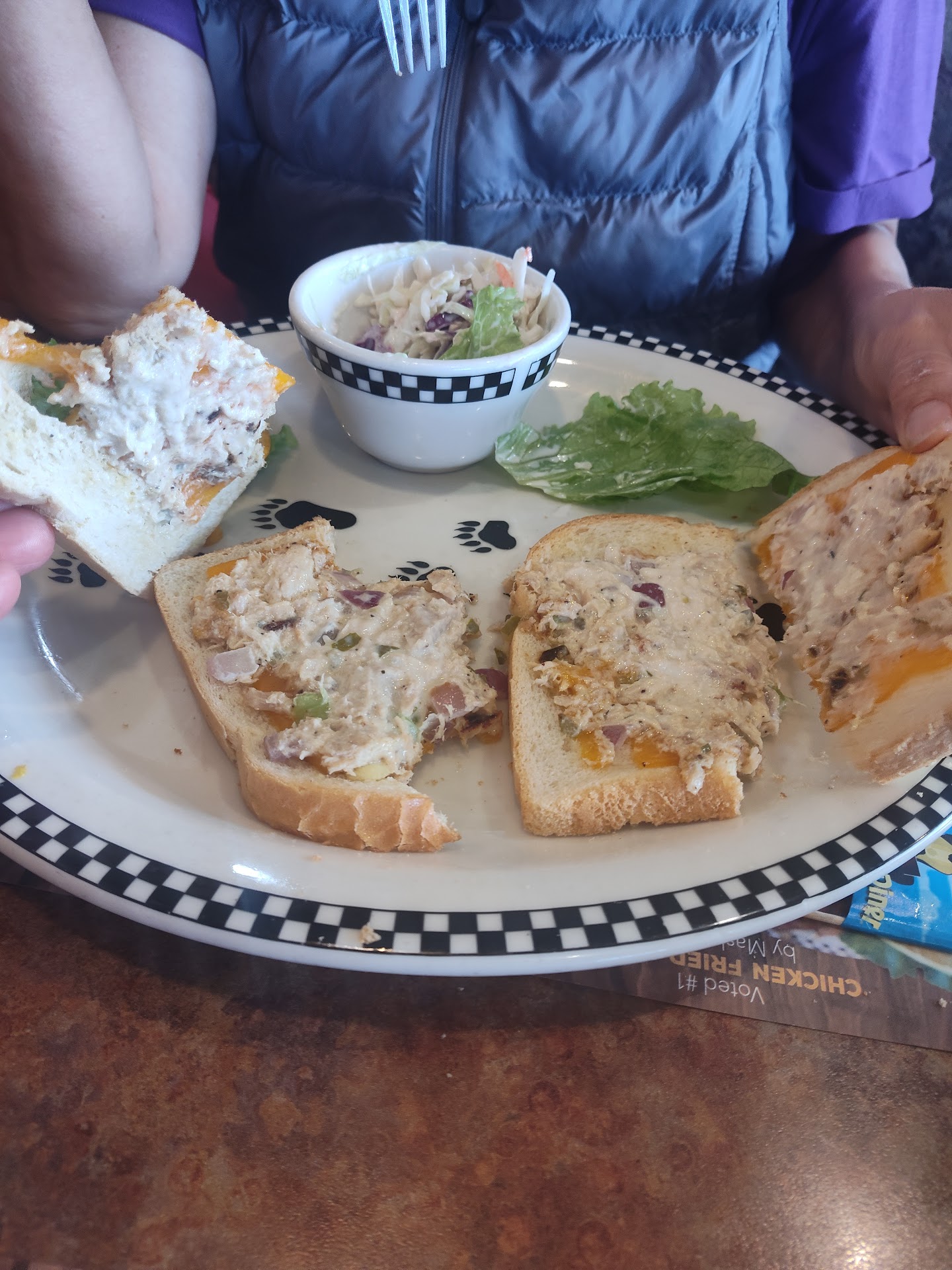 Another reminder of why we stopped going here years ago....the pictures are of a sandwich we were given to replace the first one. The first one was on different bread and about a quarter of the size as the one pictured. When the first sandwich was delivered, the person who ordered it asked if that was for a child, that's how small it was, comical in comparison to the large empty plate it was served on (was as big as the little round dish the coleslaw served in). The waiter then notified us that they ran out of the bread it's supposed to come on. Asked us if we want another half to the sandwich, which the three halves still equated to less than a half of normal size. The person said no, and almost changed their entire order (mind you everyone else at the table had already been served), when the server finally asked if we wanted the sandwich on sourdough - we were skeptical but he promised it'd be normal sized. Hesitantly, we agreed. The nerve the chef had to bring out the sandwich in the picture - not only was the cheese unmelted, there was tuna only in a small circle in the middle of the bread. You can clearly see how much bread in proportion to tuna, I took a bite and only tasted bread. After the waiter ignored us for the next 20 minutes (never coming around once to even refill our coffee), we finally were able to get his attention and asked for more tuna. He tried arguing that the amount of tuna present was the exact same amount that was in the first (very small, incorrectly made, and improperly offered substitutions in a timely manner). I argued with the waiter, that if he could please just bring us enough tuna to cover the bread, we'd be somewhat happy. On top of that, the country fried steak and country potatoes were also ruined by the chef, who chose to mix raw red onion and raw bell pepper in with the over cooked, soggy potatoes. If I wasn't in a rush, I would've demanded a manager, but even if our meal had been offered to be comped, I honestly will never go back to this black bear diner location in Hayward, Ca across from Chabot College. This experience has reoccurred each time we've tried to give them a chance for redemption. If they still can't get it right after all these years, I'll save my frustrations and money to go somewhere where the chefs actually take pride in their work, and floor staff care about the patrons. Maybe they need higher wages? Who knows. I give up on them! Even their eggs are overcooked. Best thing here is the free...