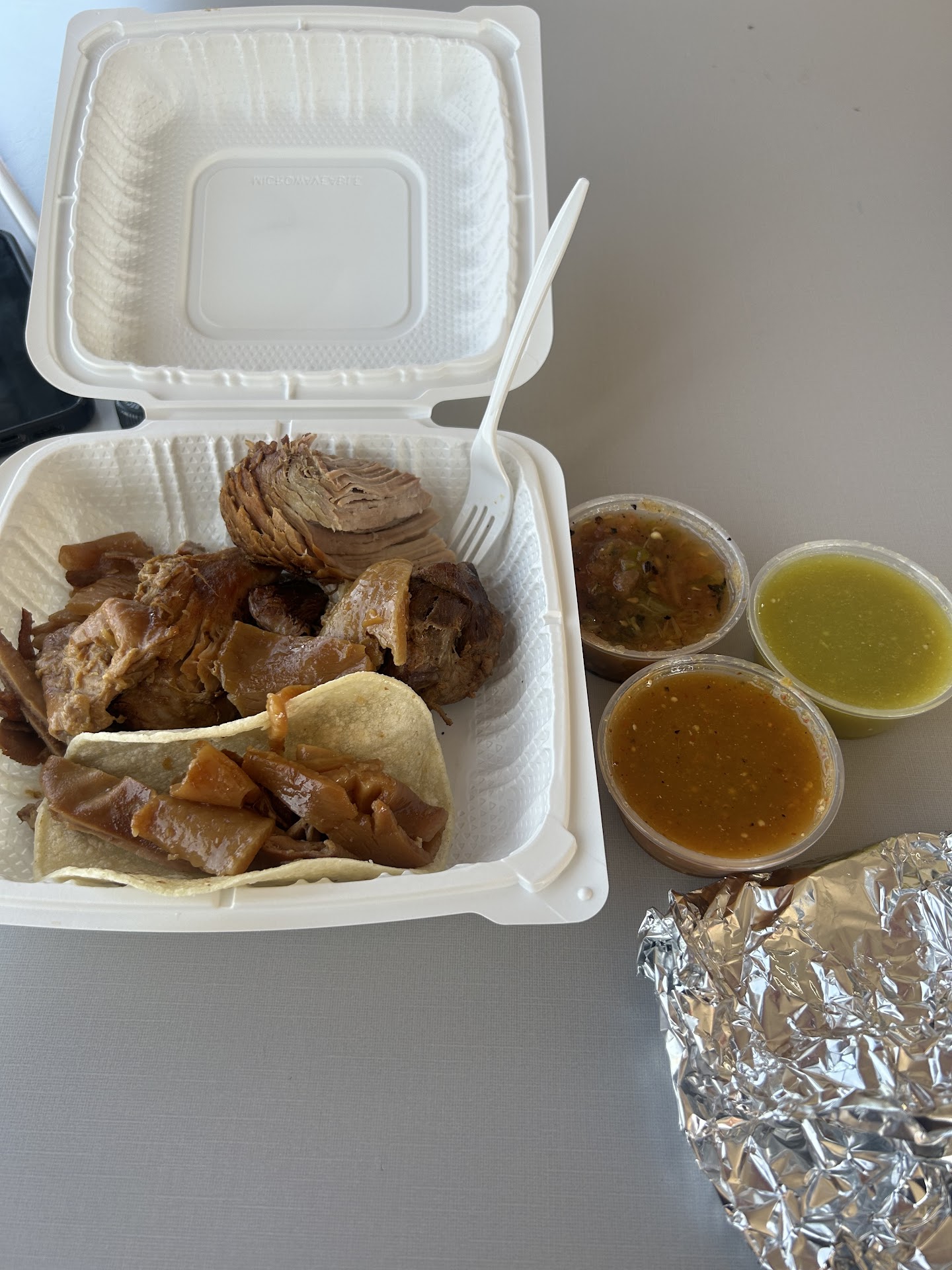 Read moreJust moved to the area and wanted to try this place. Just got a pound of meat. Most of it was fat and boiled skin. Not much flavor. Very greasy and not really fresh. I can only tell by the extremely hard and dried pieces. The hot sauce was very good. Got spicy, and if you like spicy but not too spicy this is perfect. I have had hotter but enjoyed this one a lot. I will give it another try and get a burrito or tacos. I understand some places could have bad days. This is why I am willing to give it one more try. The price was on point for what the cost of meat is, but would not pay that again due to the lack of flavor...