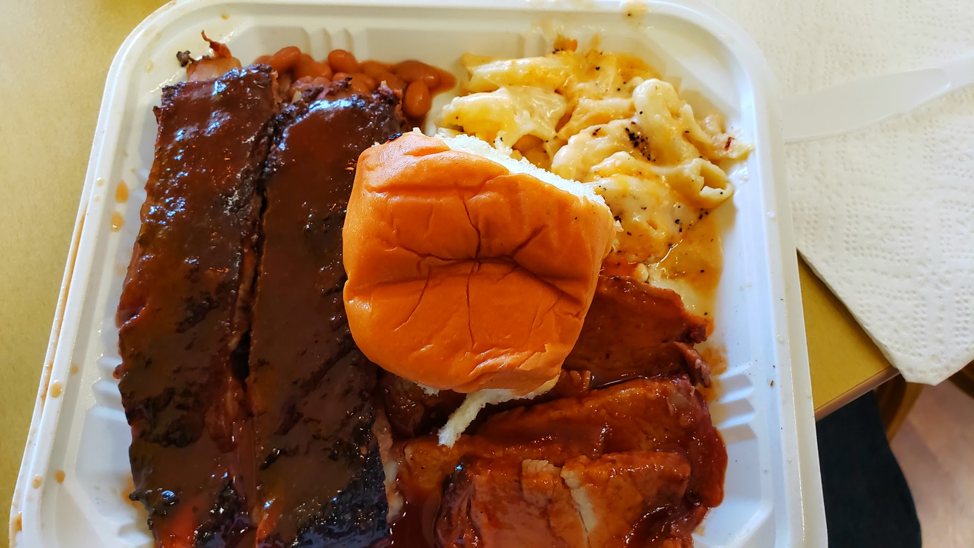 Ribs (my mouth is watering for more) with green beans (wow, what is the magic seasoning here?) & potato salad (there are no words for a loaded-with-flavor bomb). Tri tip (juicy and yummy) with candied yams (yes! no skimping on the spices) & potato salad (ditto from above). Wow - all great choices with more sides and dessert to try on our next visit!