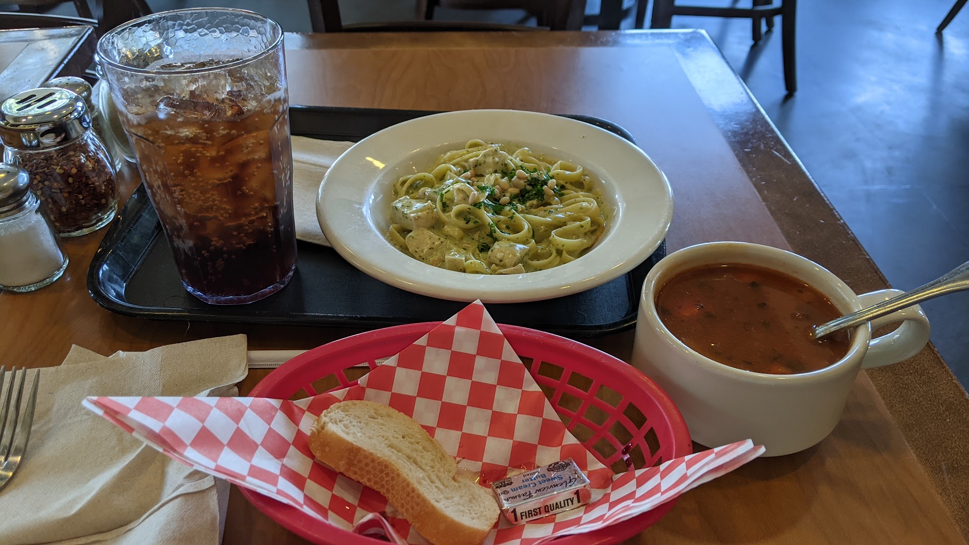 Otherwise, all the food tasted just meh. I ordered a chicken pesto (pasta) lunch special ($16.60 including tax), which comes with a salad or soup, and drink bar access. My pasta flavor was underwhelming and texture was slightly overdone. Veggies in my minestrone soup were crunchy in an undercooked way.