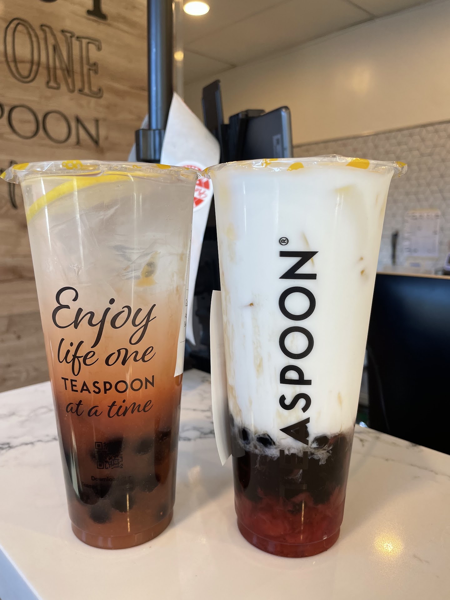 Read moreThe service and drinks are decent enough. Had a weird experience last time though. My friend called in an order for us and the girl taking the order said "Sorry store policy we can't not put the Boba" when we asked for mine to not include Boba..... my frie d had to ask if instead she could just take the Boba that would be in my drink and put it in hers.... if that is truly Policy it's absolutely stupid. And if not they might need to revisit a Lil training. The drink flavors are decent all in all but Teaspoon really lacks on choices and couldn't find any plain Boba like all the other places, only honey. There's also not really a place to sit. As a huge Boba fan I recommend going somewhere else like the Quickly's down the street by FoodMaxx or the other Boba place by...