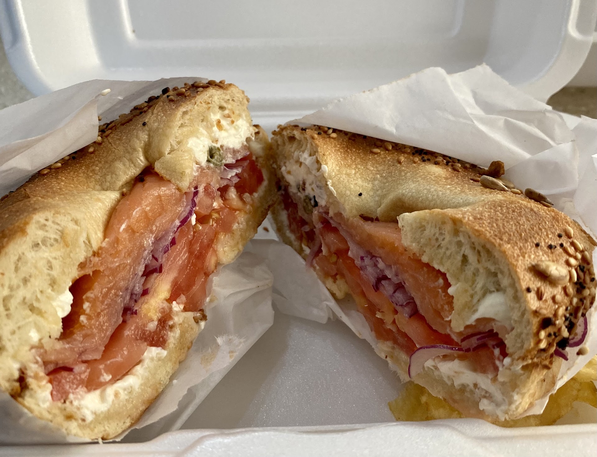 Bagels are fresh with good ingredients. I had the lox on sourdough. The bagel was as slightly chewy and tangy as it should be for sourdough, and the inside was soft, the lox and other ingredients were good. Lox bagel served with chips.
