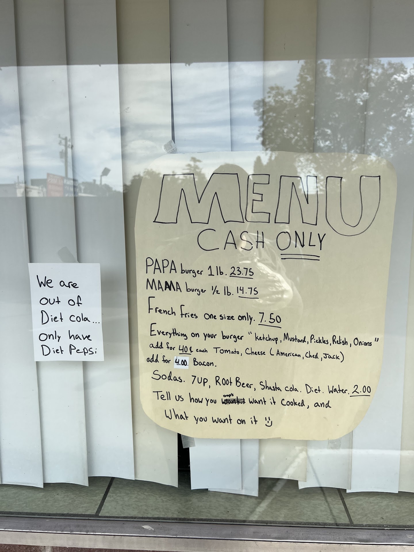 Since COVID, Valās has changed dramatically. They never really reopened in any meaningful sense. They are now only open two days a week, cash-only, with an extremely limited menu. Prices have climbed to the point where two burgers and fries now cost around $50. Thatās a steep price for what is now a takeout-only setup.
