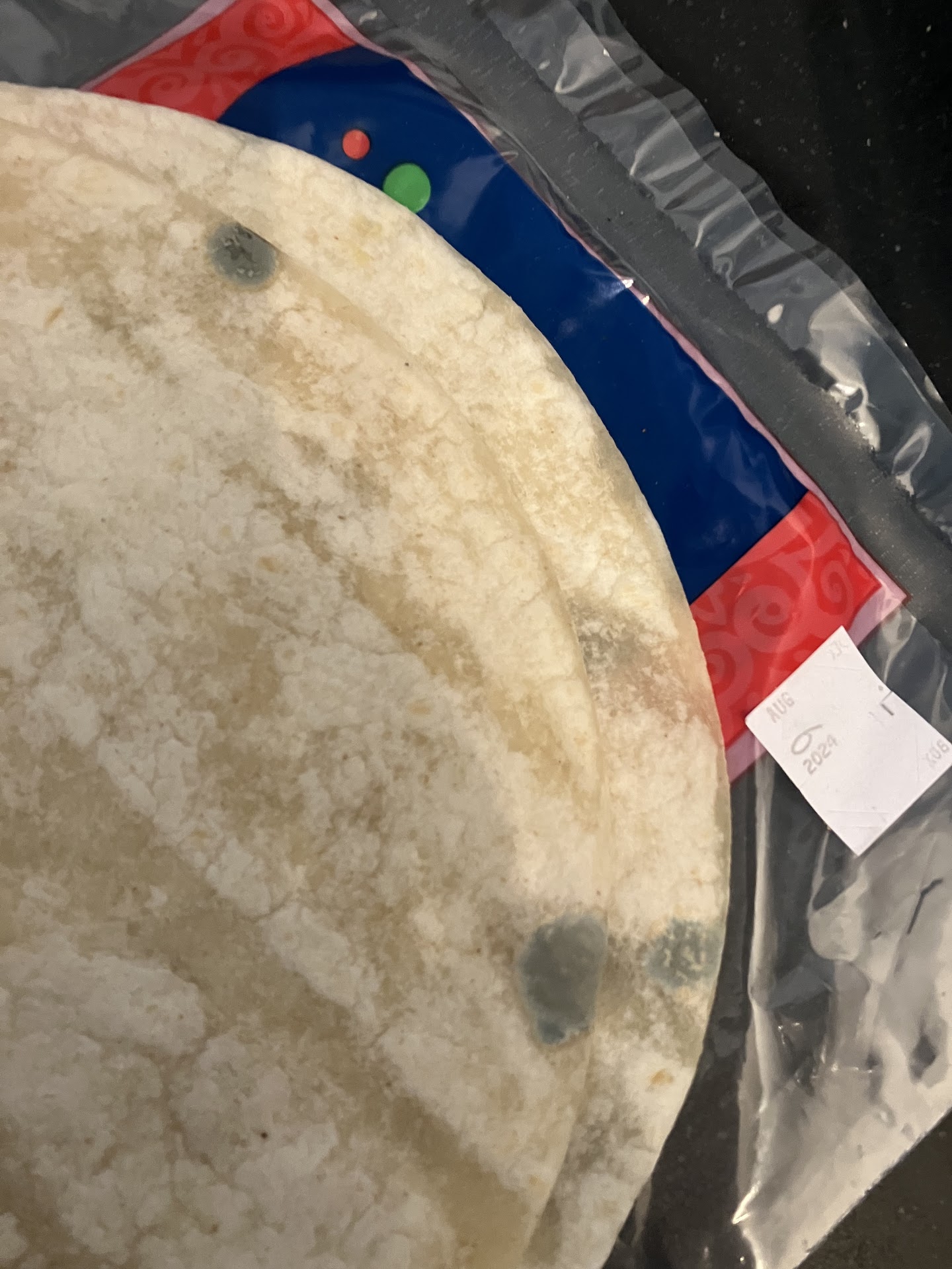 Moldy tortillas way before their expiration date. I took this picture 7/31 and the expiration date is 8/6. This is the second time I’ve purchased these tortillas that went bad too soon, having to throw them away and waste money plus risk the chances of encountering moldy food!
