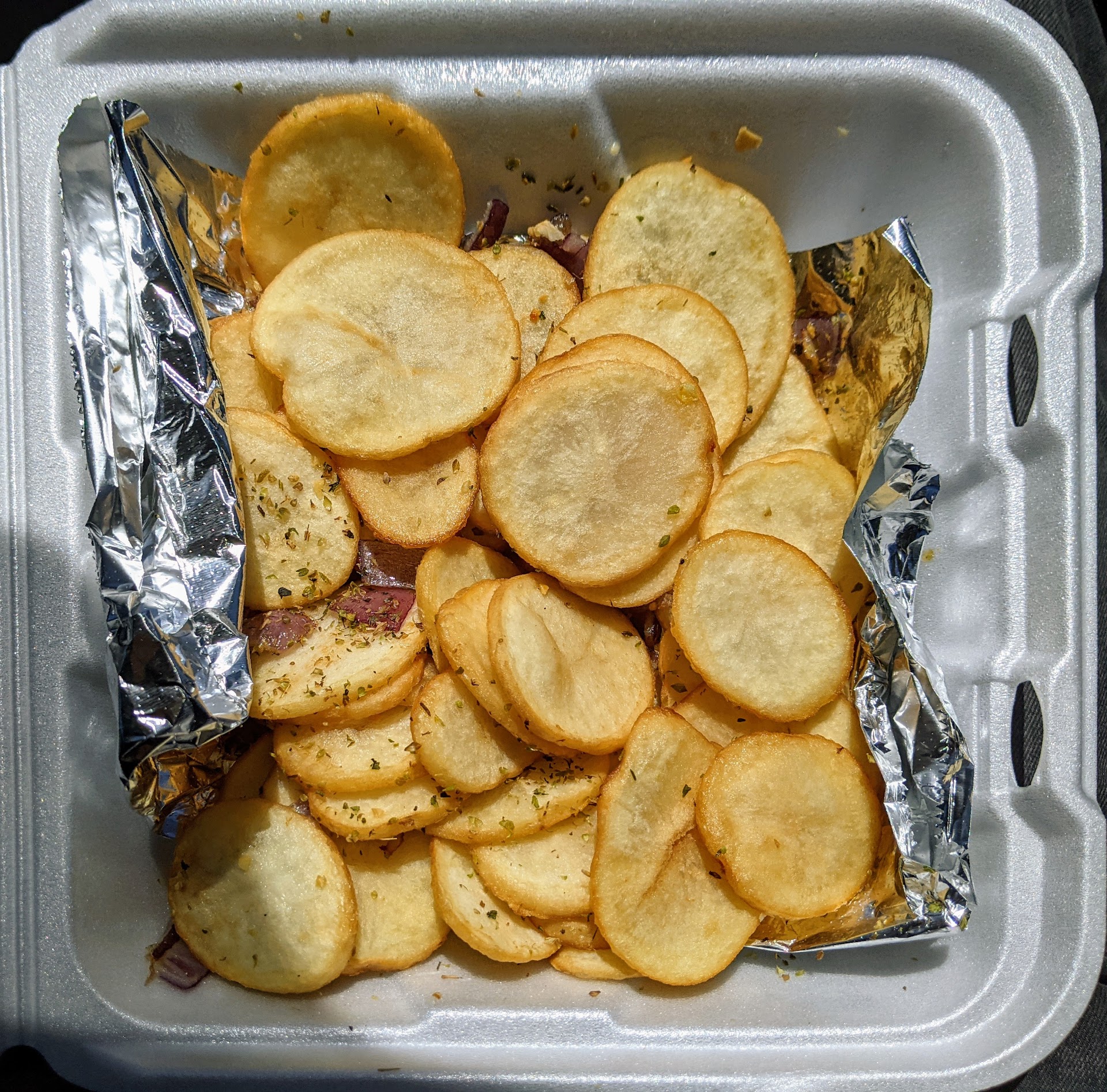 The side of potatoes are utter junk however - just chips of potato (slices) deep fried with no seasoning. They taste bad and feel bad too.