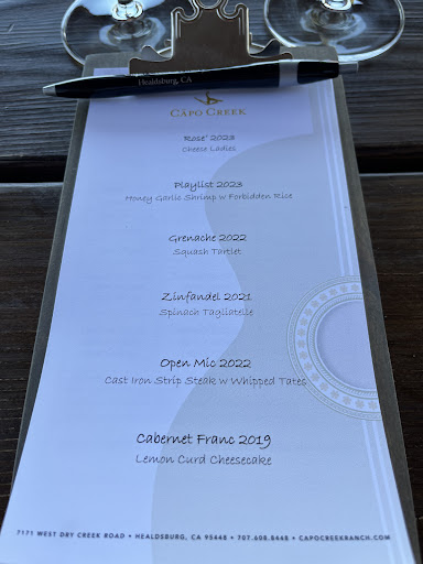 We recently returned from a week-long trip to Napa and Sonoma, and we can state without reservation that our lunch and tasting at Capo Creek was an absolute highlight of the trip. Our group of four booked the VIP lunch experience with Mary Roy (the owner, winemaker, head chef, and all-around BOSS of the place). We simply cannot recommend this experience highly enough — it was transformative. If you are anywhere remotely near Healdsburg, GO!