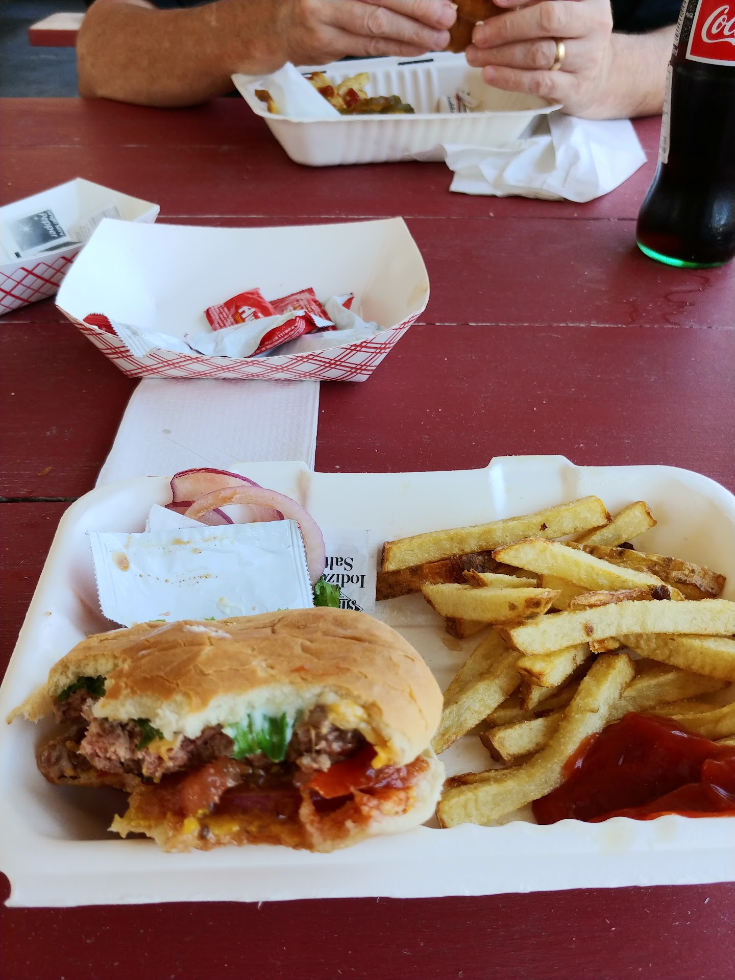 Let me start by saying simply: GO HERE! As a former burger flipper, you'll be hard pressed to find a better burger shack with more affordable prices, better vibes, and most importantly, better food anywhere within a two hour drive of this location. The staff are jovial and really seem to enjoy what they do. The food is top notch, letting you customize your burger to your hearts content, with endless made-from-scratch options. You can tell these guys really love what they do. I do a bacon-blue cheese burger with provolone and I really haven't had a burger that compares since the old days of Picks drive-in in cloverdale (which was owned by the same people that own this place now, so clearly there's a trend of excellence.) Plus, $20 for a huge pitcher of beer, on draft, is really an unbeatable price these days. Not to mention it's withing staggering distance to the Russians rivers gorgeous memorial beach, makes this place a must visit location for any vacation. Best burgers in wine country, hands down, like I...