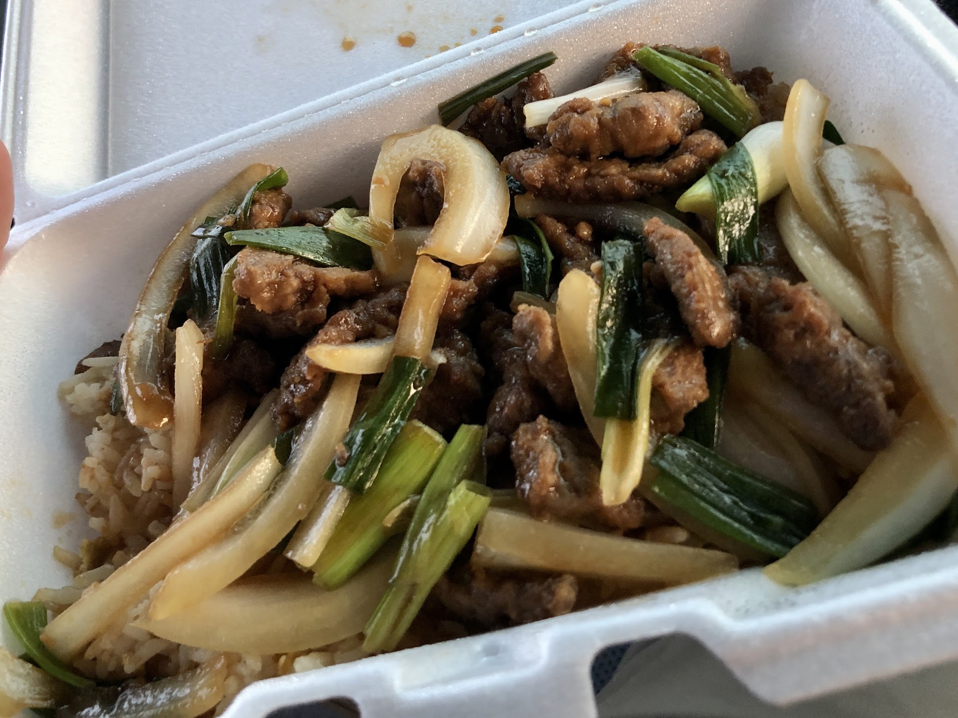 Now the food. It was hot and it was fresh but both meals. Mongolian beef and broccoli chicken with fried rice and two vegetable egg rolls leaves a lot to be desired. The dipping sauce for the egg rolls very good but the egg rolls was very very greasy and those peas was something weāve never seen in an egg roll and should be left out.