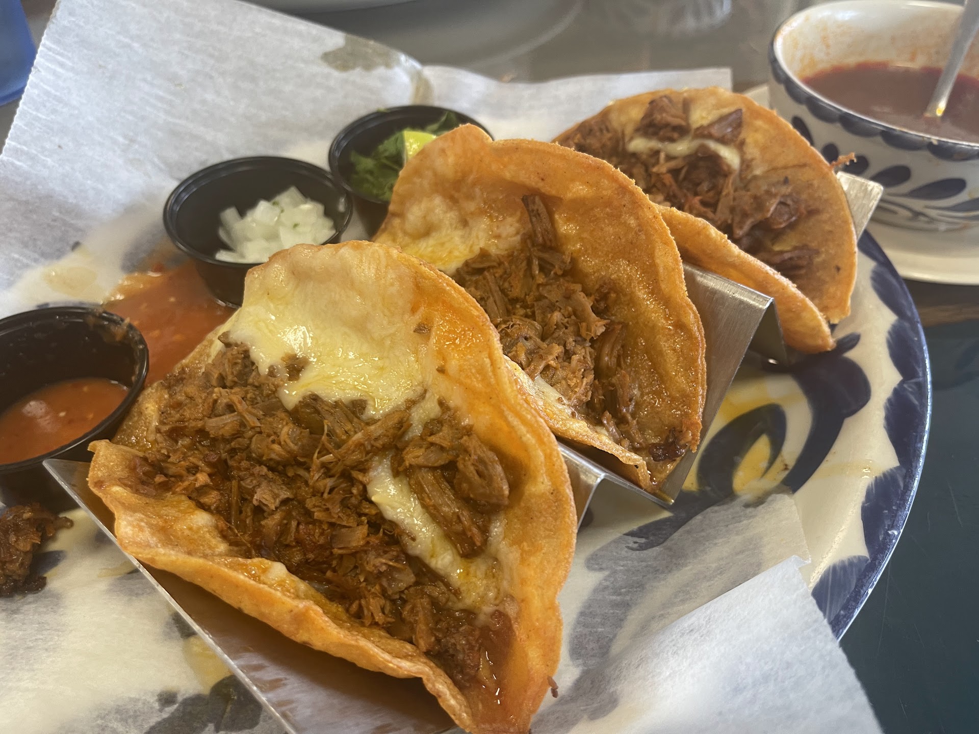 Tacos, the pork was seasoned but not overpowering to let it shine with the toppings of the tacos. The cilantro was very fresh and very good! The hot sauce was fantastic, I would have loved more of it, I used the salsa that was served with the chips. It was the perfect amount of food for myself.