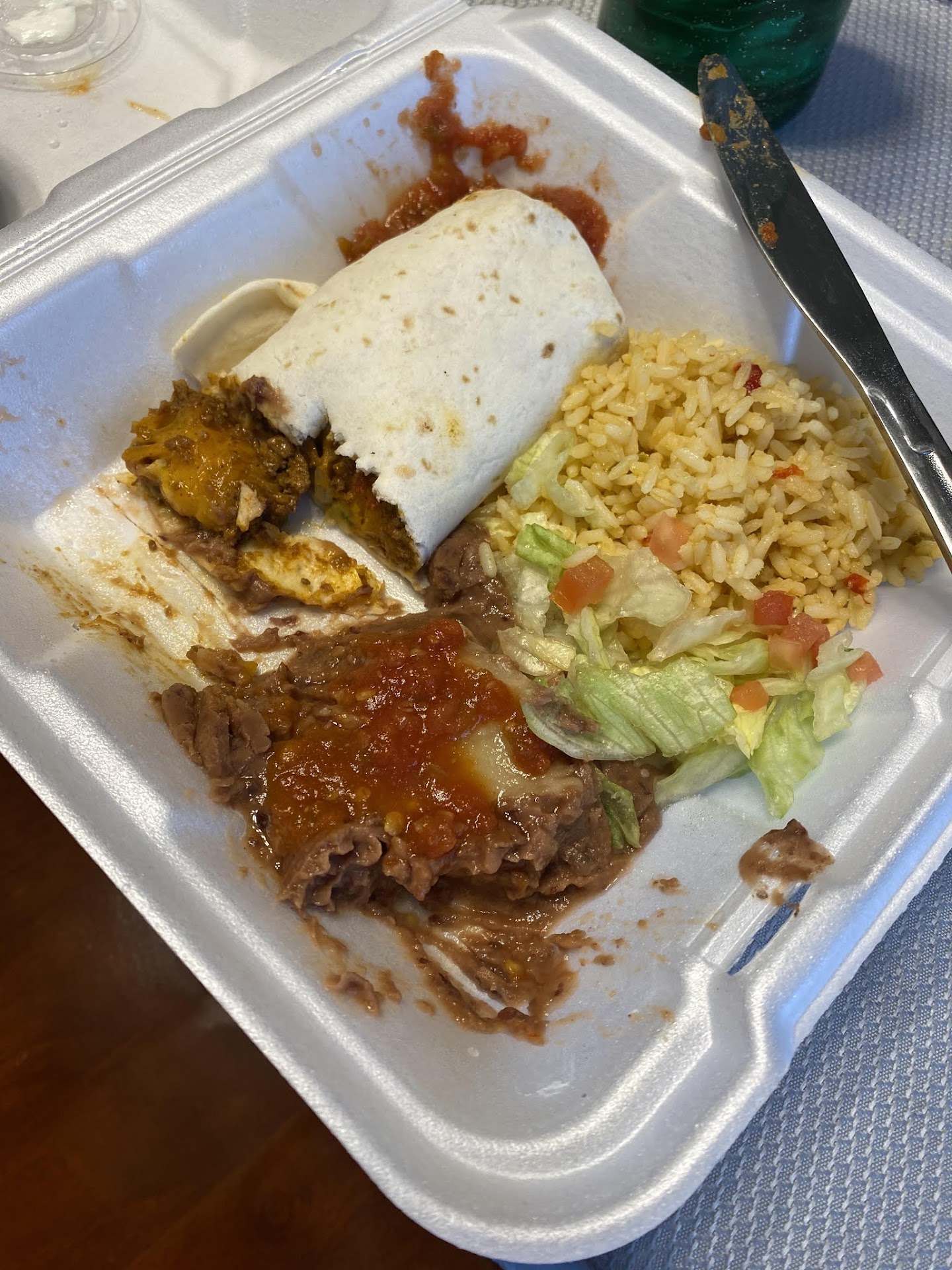 Obviously, this photo is after I ate a li'l bit, but the contents of this styrofoam container cost me $14 - my husband got the same thing. And it was just OK. There were maybe 3 forkfuls of lettuce and tomato, and a very small amount of rice and beans. The only reason we ordered from here is because the good local Mexican restaurant was closed, and we wanted a burrito. $14 is a little steep for a little bit of OK food. Also, we ordered by phone to pick up, was told it would be 25-30 minutes, and we showed up after 29 minutes. Food was ready, but just lukewarm. My husband overheard other customers being told it would be 15-20 minutes for their orders. Hmm... maybe ours had been ready and sat there waiting for us for 10-15-ish minutes??? Let's see some...