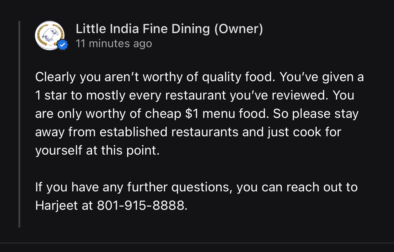 Update in response to the ownerās shit comment: the server Zeidi agreed with what I said about my order being wrong as opposed to what the menu described. I paid for my order, but decided not to consume such crappy food. A bunch of fake reviews donāt make the food good. Learn to take criticisms and improve your food if you want peopleās money. Learn something from the dairy keen next door, they serve great food and have great service and prices. So does bawarchi in Salt lake for indian food. The owner didnāt contradict any of my criticisms about their food, they didnāt say which item was good that I claimed was bad, which means you agree that I am correct in my description. You are a new restaurant so donāt call yourself an established one. I do cook much better food than the crap that you serve people that is true, so does Bawarchi if you ever want to try quality...