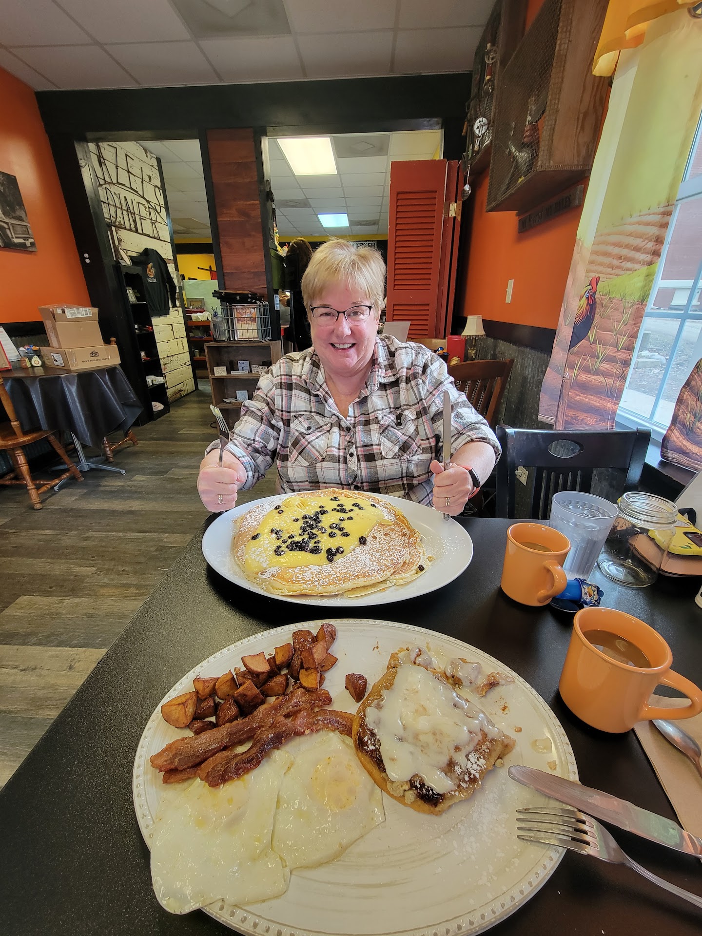 My first time but definitely not my last! Valentine's Special was 2 eggs, bacon or sausage and cinnamon roll French toast. Wow. Highly recommend the bacon - thick cut and flavorful. Thought 1 slice of cinnamon roll French toast wasn't going to be enough lol. So rich I couldn't finish it. Friend had the blueberry pancakes with lemon curd. 2 huge pancakes served on a turkey platter. Excellent! Pancakes light and fluffy, not too sweet. Lemon curd out of this world... Sausage and biscuits very good, big chunks of sausage and huge biscuit. Best coffee I've had in years. Free refills. As if the food wasn't enough to make me want to return, the waitresses were wonderful - explained the menu sizing, made recommendations, kept the coffee coming, and were so personable.