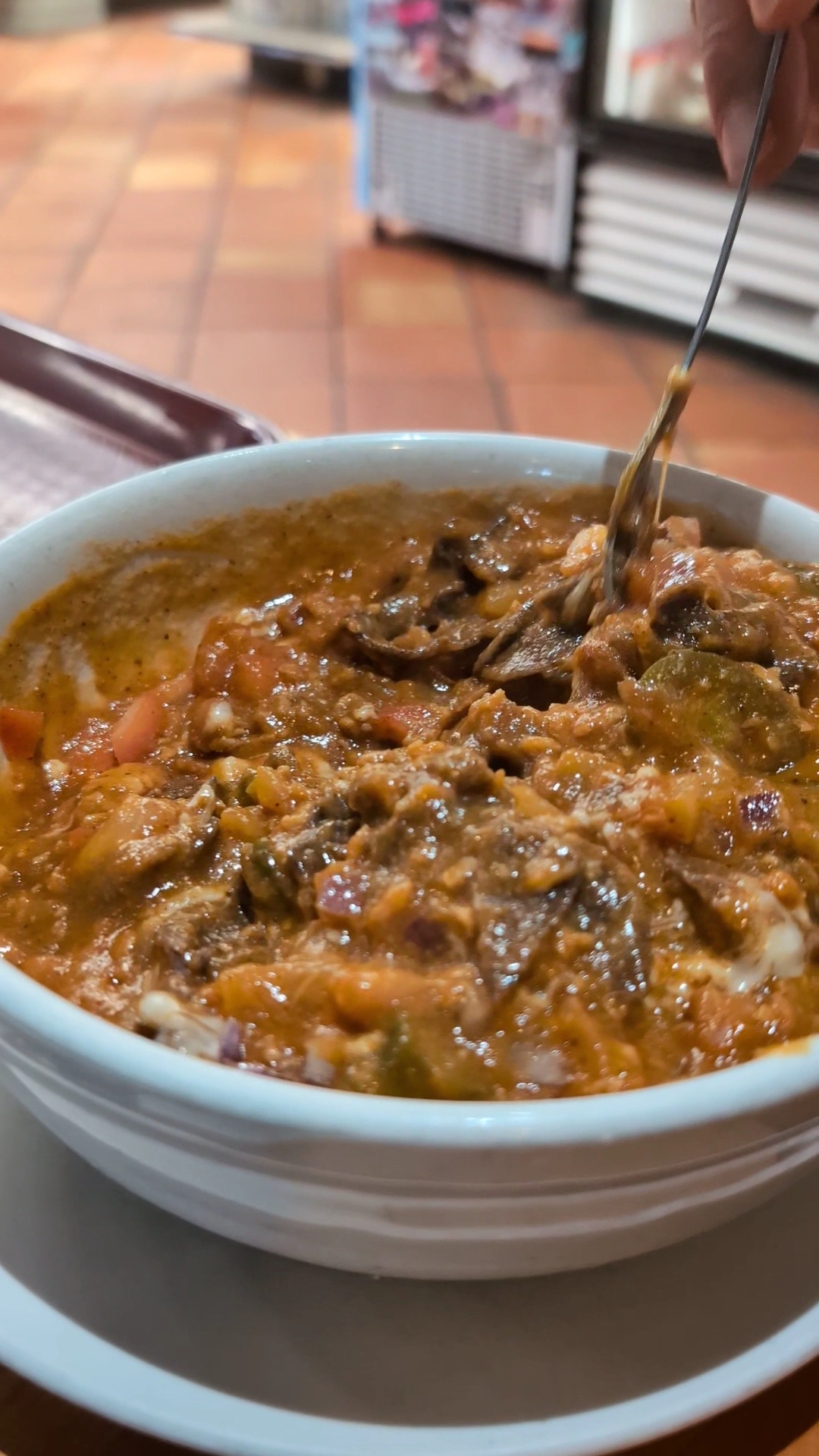 Now the burrito… the use of chili powder was about the only flavor in the meal. Yes, I got curious to take a bite. Some other flavors like onion, garlic or even salt would have waken up the dish. Other than chili, it was pretty tasteless.