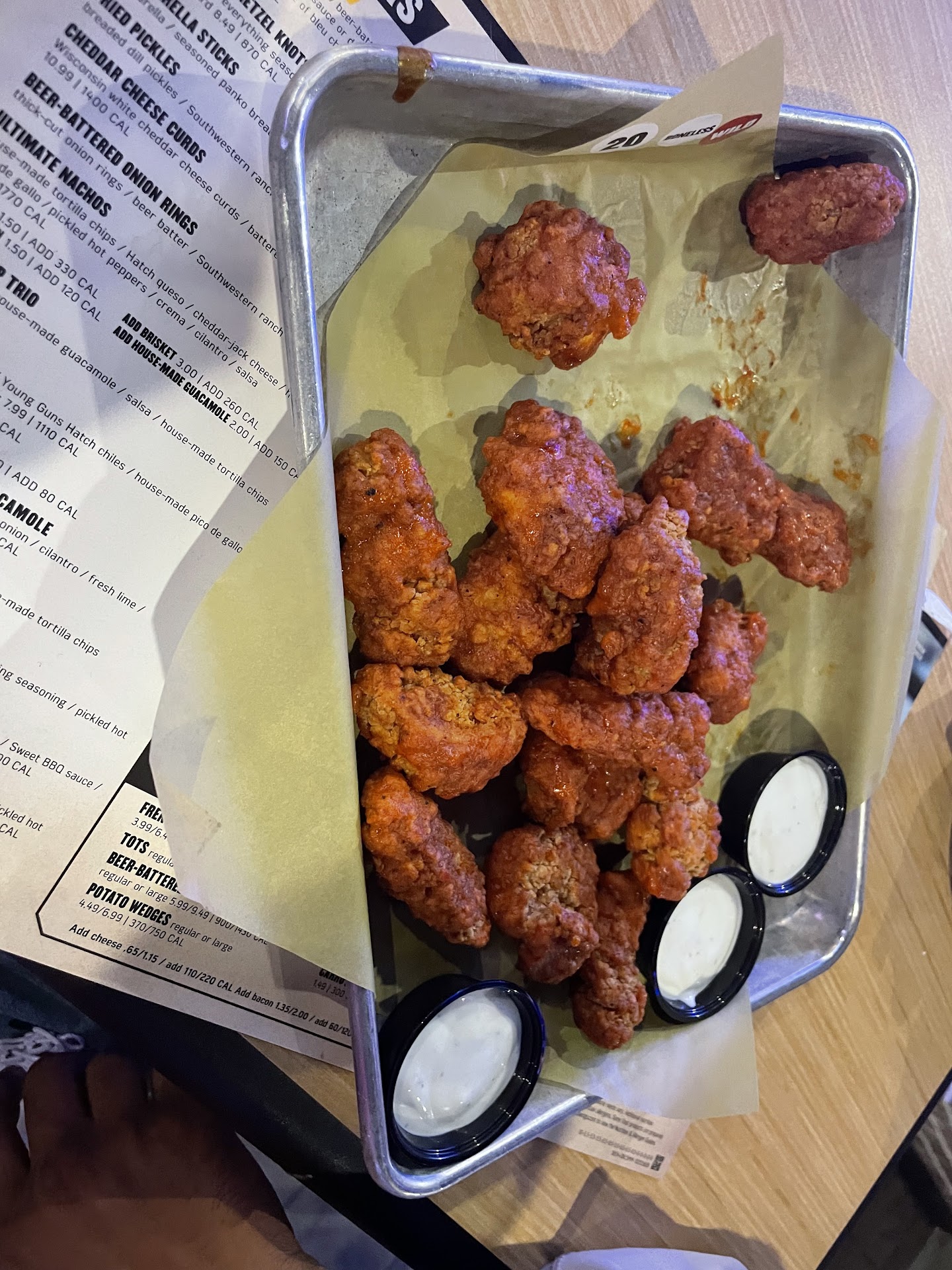 At the end of the day a one star is giving my experience more credit than deserved. I've worked in the industry before and during covid so I can understand when a restaurant is in the weeds, but the complete lack of customer service was ridiculous! We entered around 9pm. No one greeted us to seat us. There was a UFC game showing that night and we honestly expected it to be a lot buiser than it actually was. The traffic was similar to what a normal Saturday night would like like at bar/wing place. We had to seek someone out to even get a grasp on how seating worked and why there was an automatic $10 cover to dine. As we talked to the staff member he quickly mentioned that there was gratuity included. At first I didn't think anything of it. They considered this to be an "event" and gratuity included made the most sense for an "event-like" evening. We sat ourselves and waited for someone to greet us. A couple of servers passed us a bunch of times and didn't acknowledge our presence at all. So I went out of my way again to let someone know that we haven't been greeted at all and we didn't have menus and they responded rudely and with a glare that "Yeah, it's gonna be a minute". At that point I was ready to go purely off of the lack of hospitality and couth in a response, but we had realized it was getting late and we had limited options to eat out that night, especially if we wanted to go somewhere else for wings and a drink. We continued to wait until we were greeted by our server. At this point I expected to be met with the same attitude as before, but he was generally nice and answered my questions. The fights eventually started and I thought that could be something enjoyable to focus on despite the severe lack of customer service and instead I was met with audio and tv screens cutting in and out. So least to say I couldn't even enjoy the fight that they were charging for. The food finally got there after waiting for a long period of time. The wings were dry and most of the seasoning was on the parchment paper rather than on the wings itself. We ordered fries and told the food runner that there was something left out of our order. He said he would get them and we didn't recieve them until we were practically done with our food. You could tell (in the photo) that there were barely any fries on the plate and they were cold. Our server acknowledged the wait for the fries and took it off our ticket. Our server was honestly probably one of the only staff members that seemed to be working the hardest there.