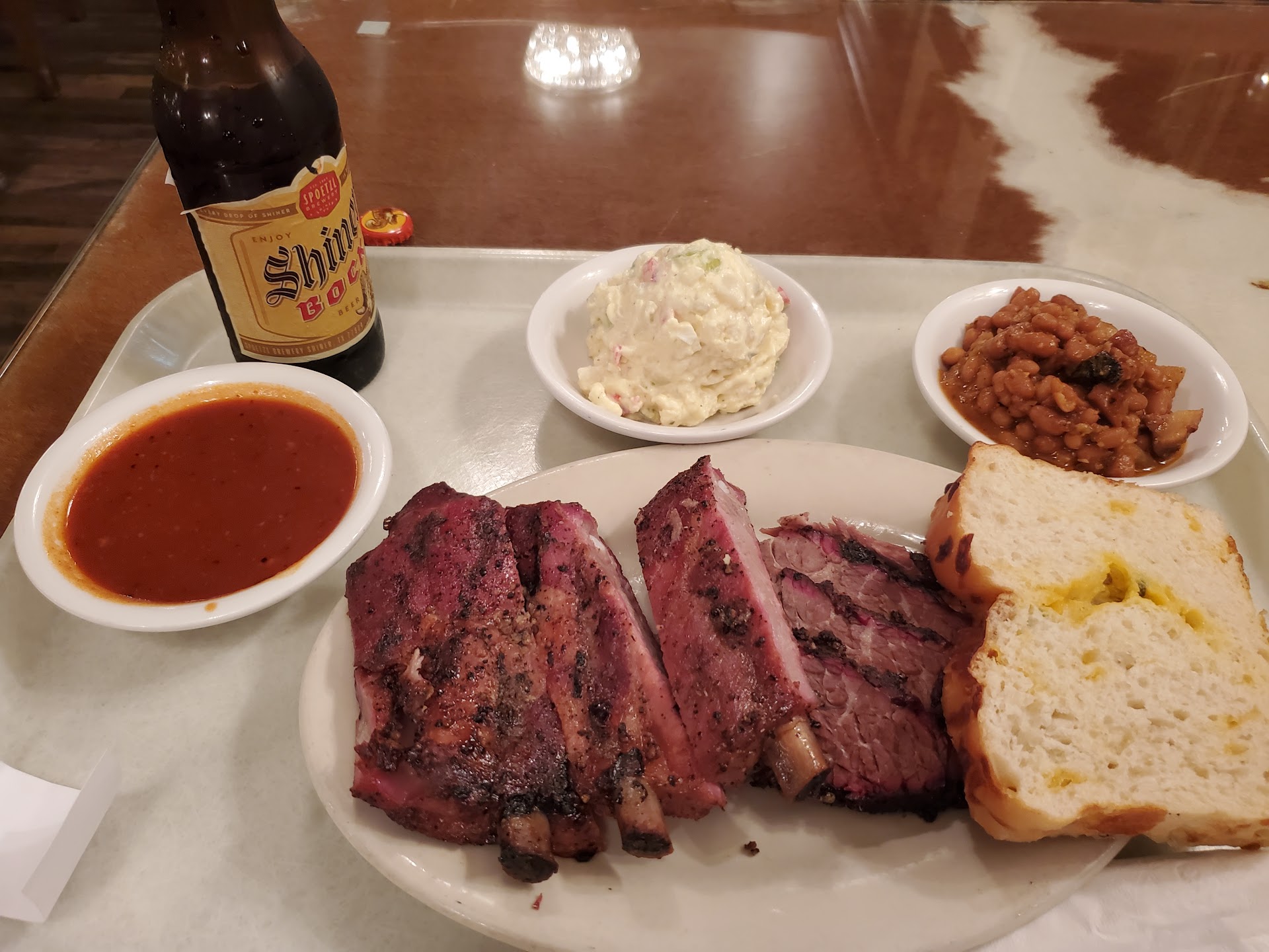 (2 Well I went back to this restaurant and I took some out of town family first we was the only people in line but the older gentlemen that was cutting the meat was rushing us and rude. Also I'm glad last time I only got Potatoes this time my cousin got the chicken and potato salad and macaroni my bestfriend had the sausage plate with greens and macaroni I had the ribs and sausage plate with macaroni and green beans. Now before I start like last time I mentioned that they still didn't had no waiting area for pick up orders. Now I ate in this time with my family and I still didn't see what makes this barbecue so great don't get me wrong the ribs could have been just a little more tinder and the green beans had why to much pepper in them than needed the food was good not great then I guess its was close to closing and I felt rushed while I was eating. The place was very clean even the restroom and I know we are in Texas but I felt like I was in a saddle storage facility there are just to many saddlebags all over the place to include the setup in the glass case. Also the sweet tea needs to say on it not so sweet tea so i tasted the unsweetened tea and trust me it was unsweet. Now the only thing that is location on I-10 had that I liked most was the shirt's for sale in the case as you leave I would love to have gotten one but there are no sizes or pricing so who to say that you got up charged or not now I kinda like this place and I'm not on here to tell you not to go here cause everyone's experience is going to be different so just go your self and if you feel like I do and that's what this place is for to voice your opinions from any place. To be honest it's not like I'm going to stop going here I like their Baked potatoes but they could be a lil bigger for the price. Now I recieved a response from management asking for me to give them another try but sit down well I did what they ask and like I said I'm not impressed and I feel your paying to eat food at the saddle storage place. And I asked everyone how was their meal and the response I got was that they felt it was just ok and it was a little spicy with pepper. Like I said this was my experience and yours may be different so makeup your own mind and...