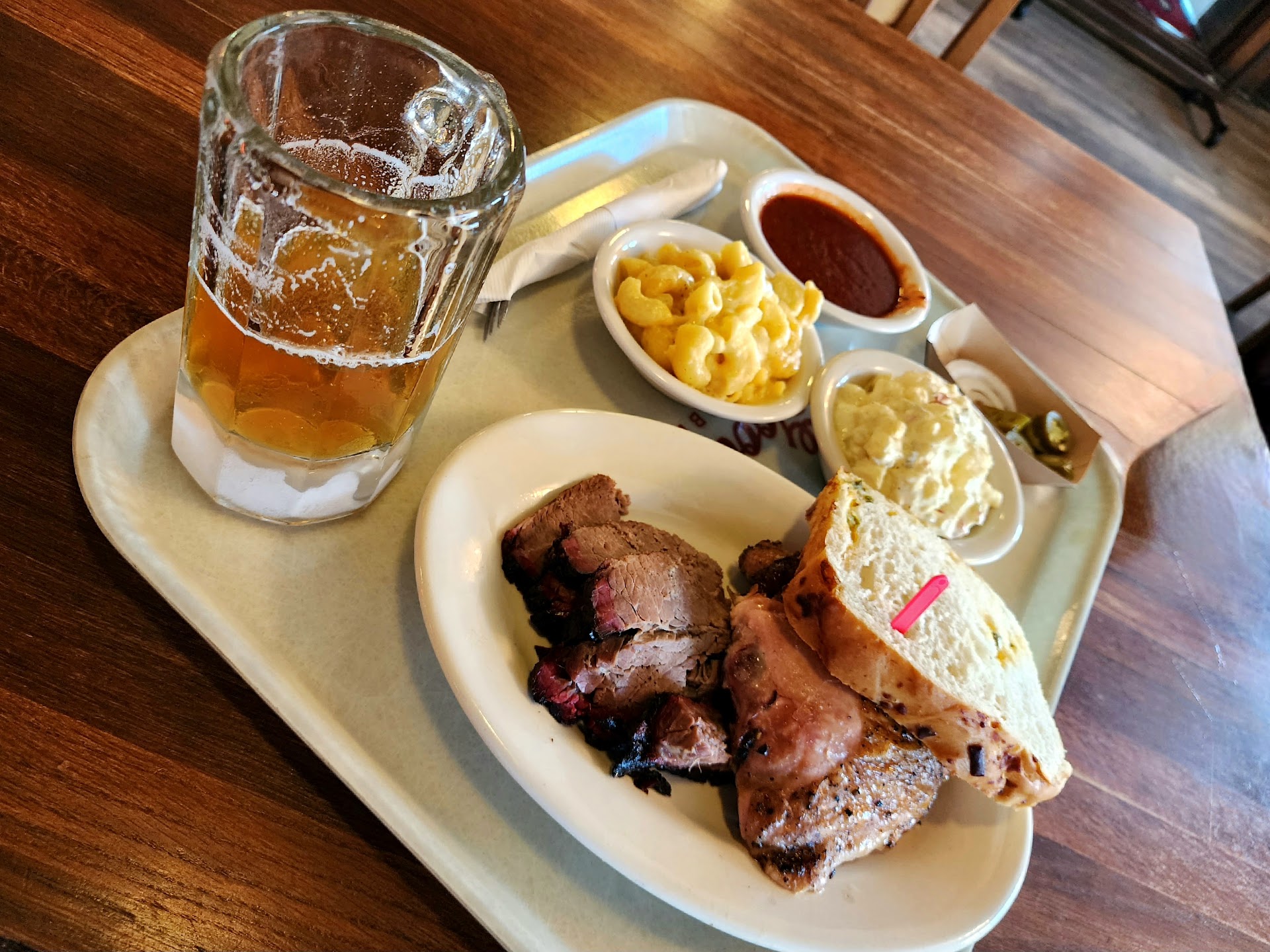 (1 My visit I ordered two baked potatoes and a sandwich. He sandwich was small as hell not worth the 8 to 9 bucks the potatoes wasn't bad but small but the one my son got was scorched but I spent $32 bucks to be honest they over charge because of the atmosphere the food was just ok it was good but ok nothing different then then any other Bbq place but for what I got was good but from at least any other places I would have saved about 6 to 7 bucks for atmosphere that I didn't get to enjoy cause I ordered to go. But over all the food was very hood service was good. Oh! no where to sit as your waiting for your togo order.