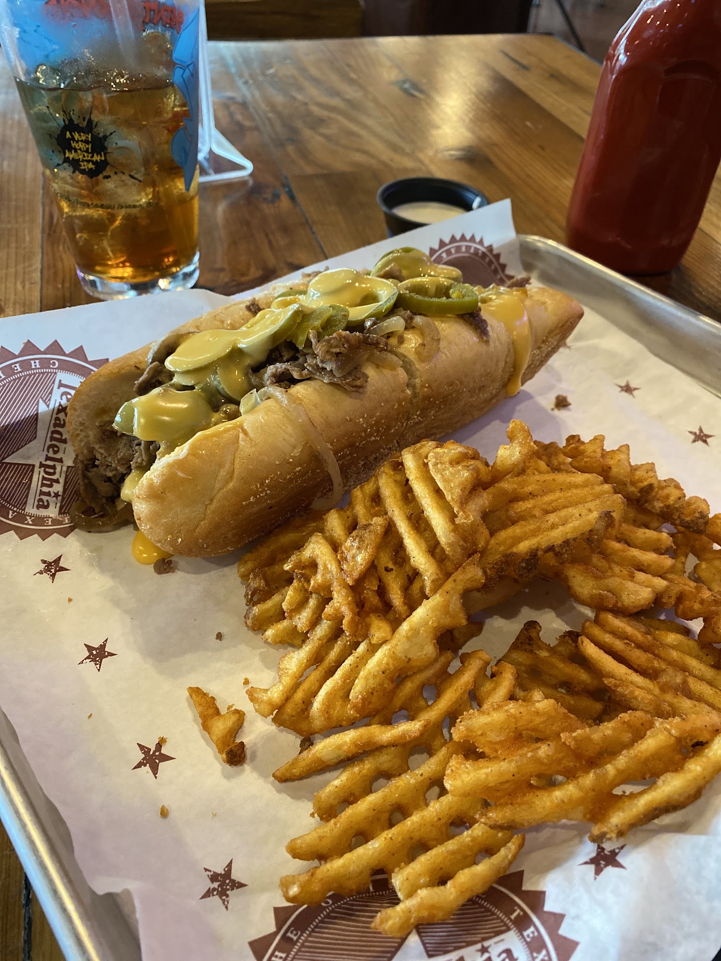 Read moreAfter 1 of my fantasy football league members suggested we go 2 Texadelphia 2 watch the NFL Draft. I told him that would be great but all Texadelphia locations closed permanently years ago. He then sent me a link 2 the Memorial location, showing me it was still opened. I haven't had a Texadelphia steak sandwich in years. Now 4 what u've been waiting 4 " The Review. " OK. Here we go. I ordered a lg ( 10 in ) orign cheese steak w/ onion rings ( $ 1.50 extra ) served w/ a side of their homemade ranch. It was well worth it. When my sandwich finally came, I was a little disappointed the sandwich. It was served 2 me room temp @ best while the onion rings were hot. I should have sent it back, but I was hungry. So I proceeded 2 eat it. The bread was warm & soft. The steak itself could have used a little more seasoning. The onion rings were very good & tasty 😋 especially w/ their homemade ranch. I'm not a ranch ( dressing ) fan, but I was last night. I dipped my onion rings into their homemade ranch dressing not knowing @ 1st what it was until I went back & looked @ the menu. You ask me would I come here again ? YES !!!! PS : If I get another room temp sandwich, I will...