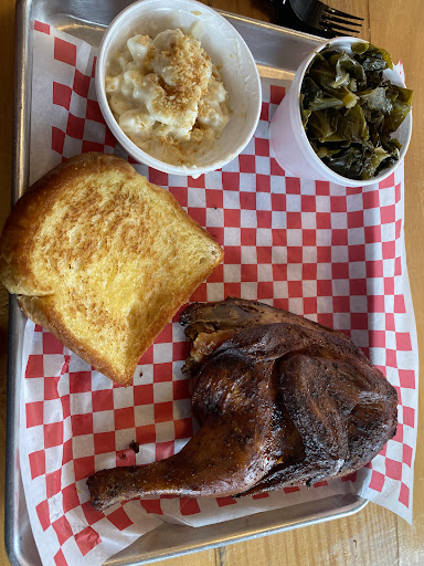 This was definitely a good spot in Helen GA. I ordered the half chicken with Texas toast. Collards, and Mac n cheese. The Mac n cheese was almost perfect (4.8/5) The breadcrumbs did not add anything to them. It just gave it an odd texture. (Fix that) The collards were good (3.5/5) they need a bit more flavoring. I recommend cooking them with turkey neck. It will bring out lots of flavor that it was missing. Texas toast. Well it was toast. (5/5) Smoked chicken was very good (4.5/5) You can definitely taste flavor and the skin was delicious. Most of the meat stayed nice and juicy. However the breast portion was VERY dry. I recommend basting the breast portion once or twice extra with some butter when smoking it so that it doesnât come out nearly as dry. Now for the BBQ Sauces Mustard based: tasted like Dijon mustard from the bottle. Iâm from South Carolina and was hoping for a good Carolina gold bbq sauce. Sweet: best one. No notes. Keep it as is. Hot: no notes. Keep as is. Ranch bbq sauce: throw that out. Tasted like mayo with bad bbq sauce. Donât serve nasty sauces like that. This was the nastiest sauce. Inedible.